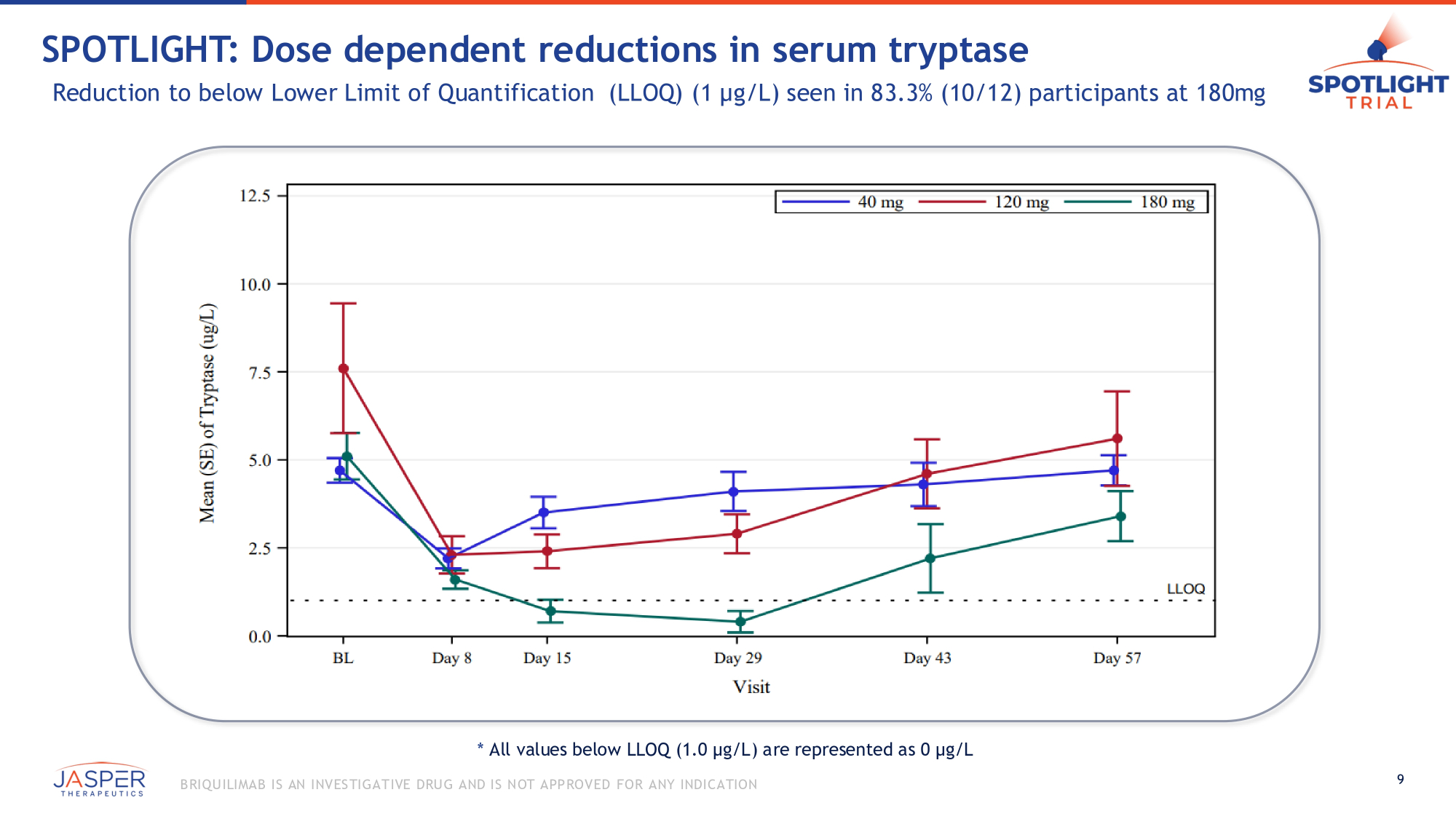 SPOTLIGHT Baseline Demographics Briquilimab 180mg Briquilimab 120mg Briquilimab 40mg (n=12) (n=12) (n=3) 39.9 (16.0) 46.4 (13.8) 35.3 (8.0) Age (years), mean (SD) 7 (58%) 8 (67%) 1 (33%) Female, n (%) 86.5 (54 - 104) 99.0 (57 - 115) 86.0 (69 - 94) Weight (kg), median (range) 3 4 1 Cold Urticaria, n 9 8 2 Symptomatic Dermographism, n Baseline Provocation Threshold 18.7 (10 - 26) 20.8 (15 - 27) 16.0 (16 - 16) TempTest TM ( ƒ C), mean (range) 3.7 (3 - 4) 3.9 (3 - 4) 3.5 (3 - 4) FricTest TM (Pin Count), mean (range) 6.5 (2.7) 6.3 (3.3) 3.7 (2.5) Urticaria Control Test (UCT) score, mean (SD) 5.1 (3.2 - 11.2) 7.6 (3.6 - 25.7) 4.7 (4.1 - 5.3) Tryptase (ng/ml), mean (range) 8 B RIQU ILIMAB IS AN INVES TIGATIVE DRU G AND IS NOT APPROVED FOR ANY INDICATION