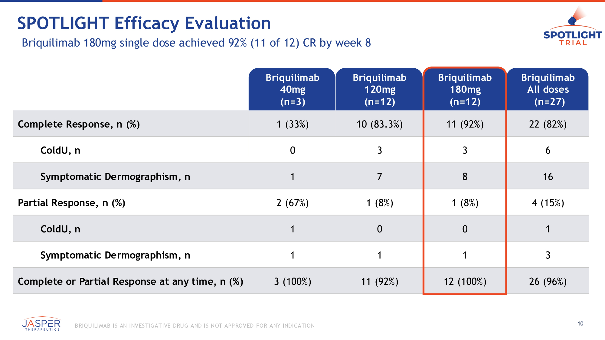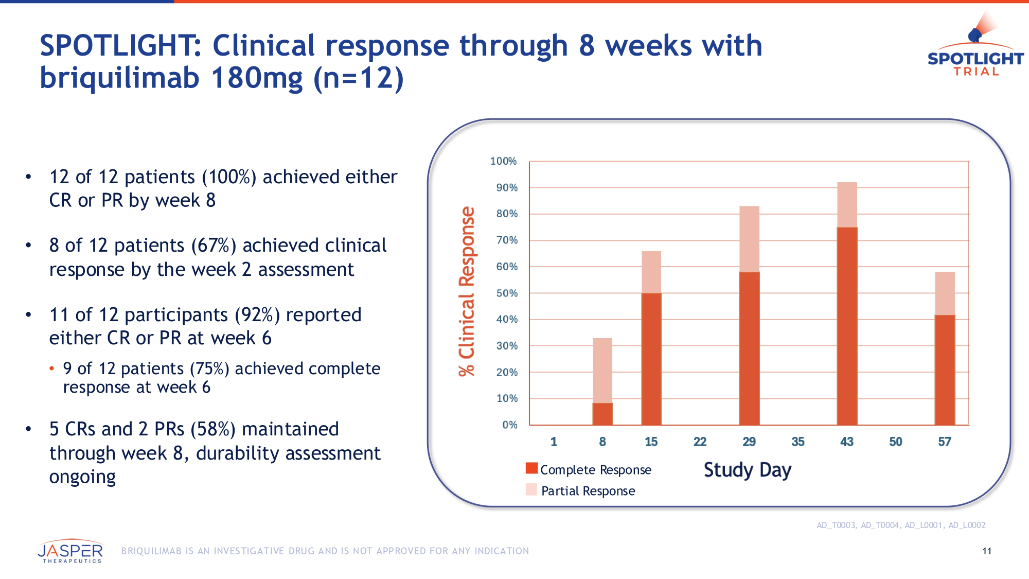 SPOTLIGHT Efficacy Evaluation Briquilimab 180mg single dose achieved 92% (11 of 12) CR by week 8 Briquilimab 40mg (n=3) Briquilimab 120mg (n=12) Briquilimab 180mg (n=12) Briquilimab All doses (n=27) Complete Response, n (%) 1 (33%) 10 (83.3%) 11 (92%) 22 (82%) ColdU, n 0 3 3 6 Symptomatic Dermographism, n 1 7 8 16 Partial Response, n (%) 2 (67%) 1 (8%) 1 (8%) 4 (15%) ColdU, n 1 0 0 1 Symptomatic Dermographism, n 1 1 1 3 Complete or Partial Response at any time, n (%) 3 (100%) 11 (92%) 12 (100%) 26 (96%) 10 B RIQU ILIMAB IS AN INVES TIGATIVE DRU G AND IS NOT APPROVED FOR ANY INDICATION