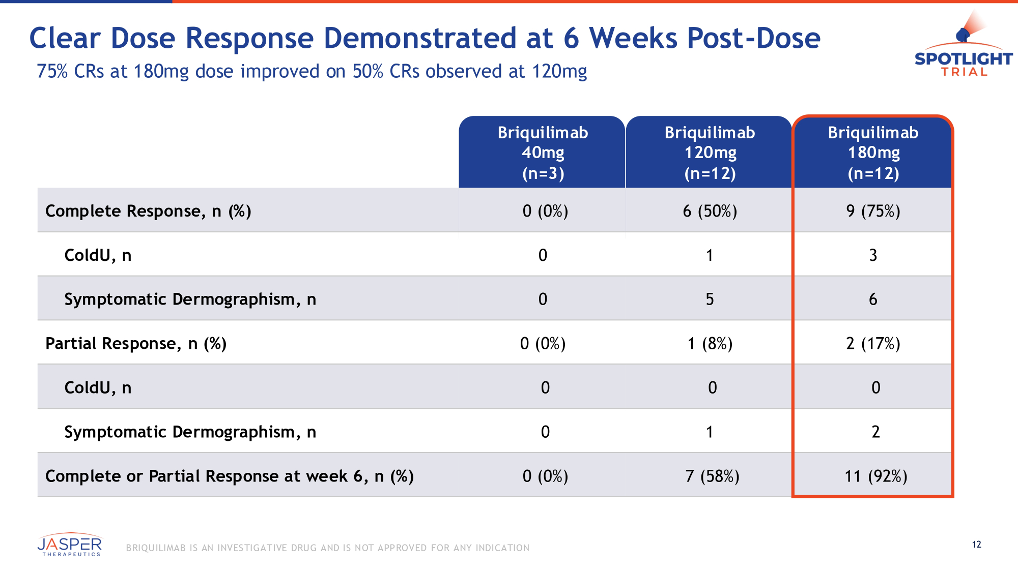 SPOTLIGHT: Clinical response through 8 weeks with briquilimab 180mg (n=12) AD_T0003, AD_T0004, AD_L0001, AD_L0002 • 12 of 12 patients (100%) achieved either CR or PR by week 8 • 8 of 12 patients (67%) achieved clinical response by the week 2 assessment • 11 of 12 participants (92%) reported either CR or PR at week 6 • 9 of 12 patients (75%) achieved complete response at week 6 • 5 CRs and 2 PRs (58%) maintained through week 8, durability assessment ongoing Complete Response Partial Response 11 B RIQU ILIMAB IS AN INVES TIGATIVE DRU G AND IS NOT APPROVED FOR ANY INDICATION