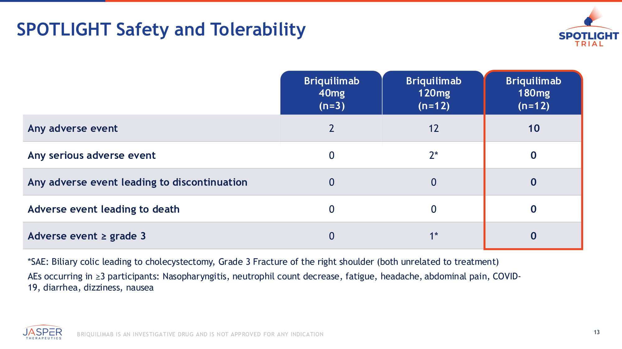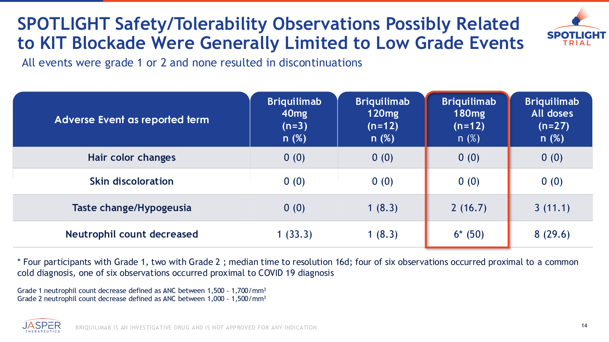 SPOTLIGHT Safety and Tolerability Briquilimab 40mg (n=3) Briquilimab 120mg (n=12) Briquilimab 180mg (n=12) Any adverse event 2 12 10 Any serious adverse event 0 2* 0 Any adverse event leading to discontinuation 0 0 0 Adverse event leading to death 0 0 0 0 Adverse event ≥ grade 3 0 1* *SAE: Biliary colic leading to cholecystectomy, Grade 3 Fracture of the right shoulder (both unrelated to treatment) AEs occurring in ≥3 participants: Nasopharyngitis, neutrophil count decrease, fatigue, headache, abdominal pain, COVID - 19, diarrhea, dizziness, nausea 13 B RIQU ILIMAB IS AN INVES TIGATIVE DRU G AND IS NOT APPROVED FOR ANY INDICATION