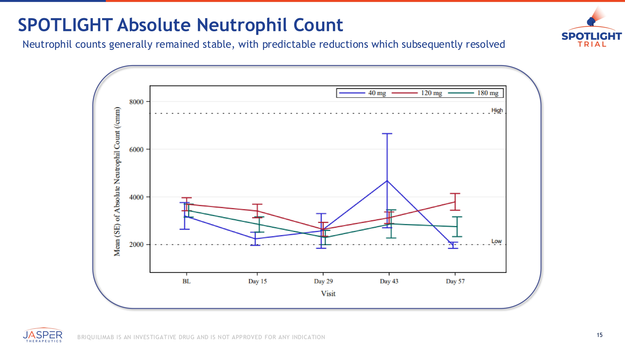 SPOTLIGHT Safety/Tolerability Observations Possibly Related to KIT Blockade Were Generally Limited to Low Grade Events All events were grade 1 or 2 and none resulted in discontinuations Adverse Event as reported term Briquilimab 40mg (n=3) n (%) Briquilimab 120mg (n=12) n (%) Briquilimab 180mg (n=12) n (%) Briquilimab All doses (n=27) n (%) Hair color changes 0 (0) 0 (0) 0 (0) 0 (0) Skin discoloration 0 (0) 0 (0) 0 (0) 0 (0) Taste change/Hypogeusia 0 (0) 1 (8.3) 2 (16.7) 3 (11.1) Neutrophil count decreased 1 (33.3) 1 (8.3) 6* (50) 8 (29.6) * Four participants with Grade 1, two with Grade 2 ; median time to resolution 16d; four of six observations occurred proximal to a common cold diagnosis, one of six observations occurred proximal to COVID 19 diagnosis Grade 1 neutrophil count decrease defined as ANC between 1,500 – 1,700/mm 3 Grade 2 neutrophil count decrease defined as ANC between 1,000 – 1,500/mm 3 14 B RIQU ILIMAB IS AN INVES TIGATIVE DRU G AND IS NOT APPROVED FOR ANY INDICATION