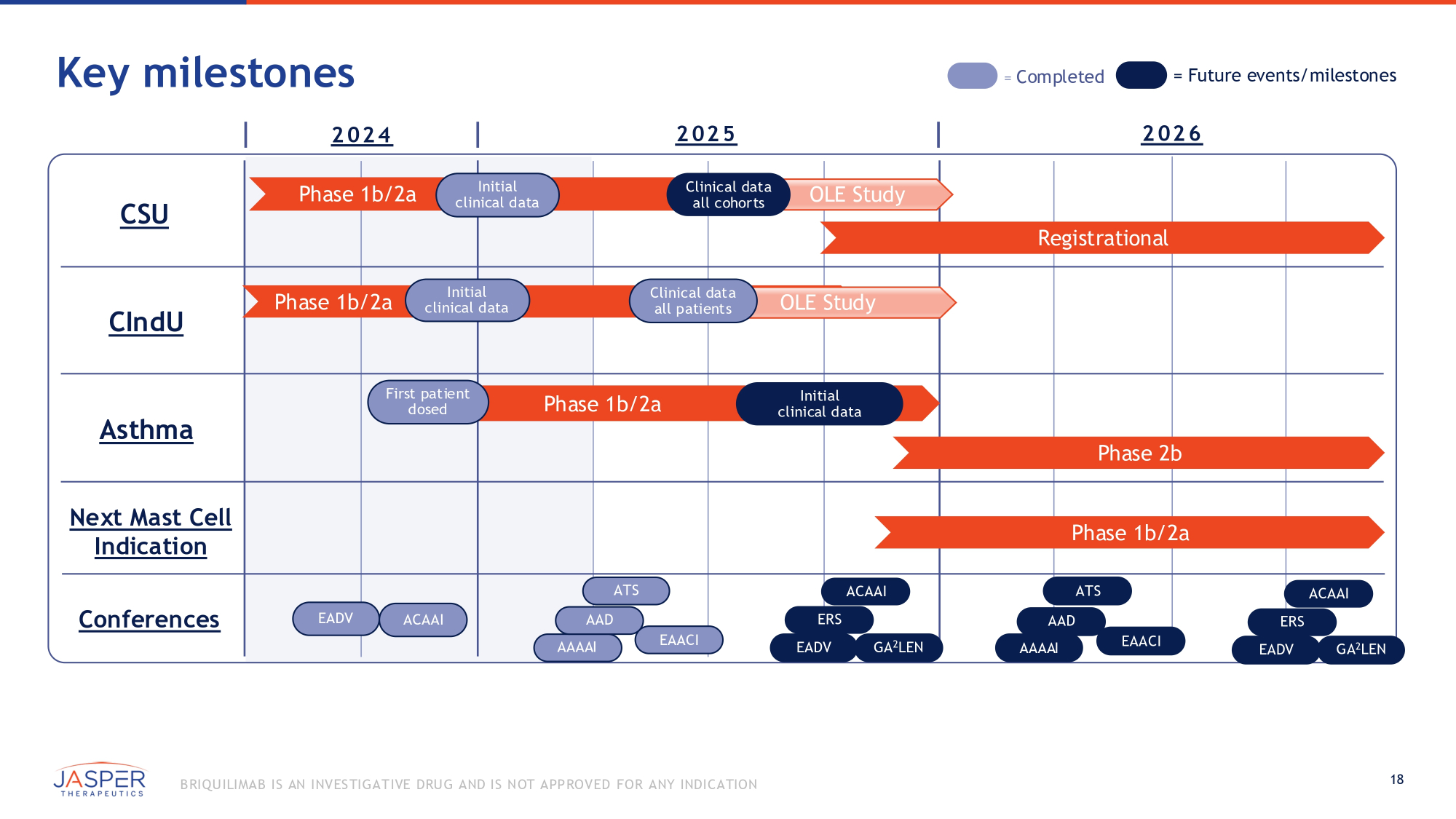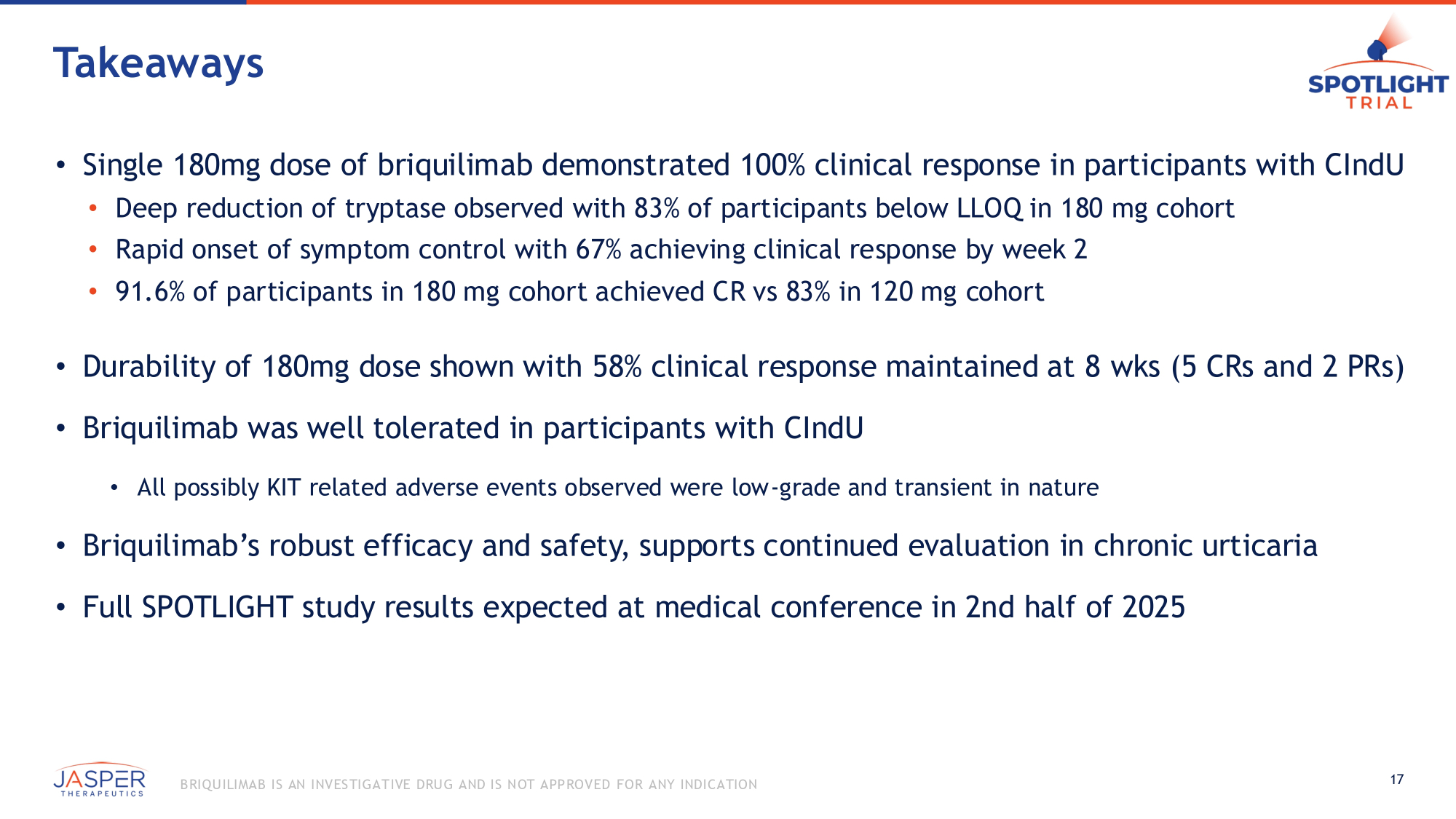 Takeaways 17 B RIQU ILIMAB IS AN INVES TIGATIVE DRU G AND IS NOT APPROVED FOR ANY INDICATION • Single 180mg dose of briquilimab demonstrated 100% clinical response in participants with CIndU • Deep reduction of tryptase observed with 83% of participants below LLOQ in 180 mg cohort • Rapid onset of symptom control with 67% achieving clinical response by week 2 • 91.6% of participants in 180 mg cohort achieved CR vs 83% in 120 mg cohort • Durability of 180mg dose shown with 58% clinical response maintained at 8 wks (5 CRs and 2 PRs) • Briquilimab was well tolerated in participants with CIndU • All possibly KIT related adverse events observed were low - grade and transient in nature • Briquilimab’s robust efficacy and safety, supports continued evaluation in chronic urticaria • Full SPOTLIGHT study results expected at medical conference in 2nd half of 2025