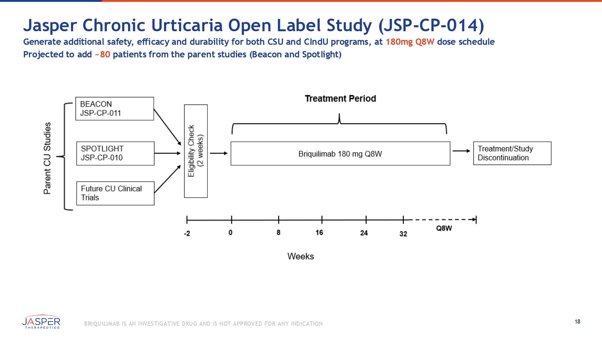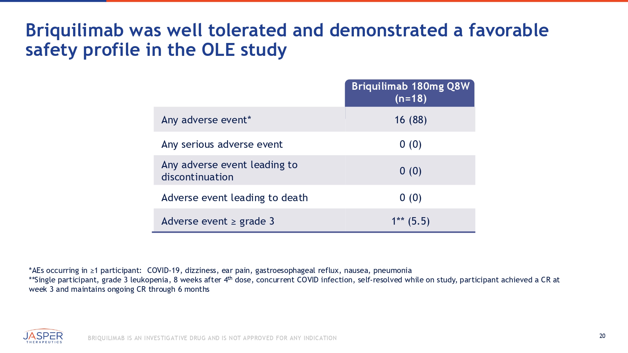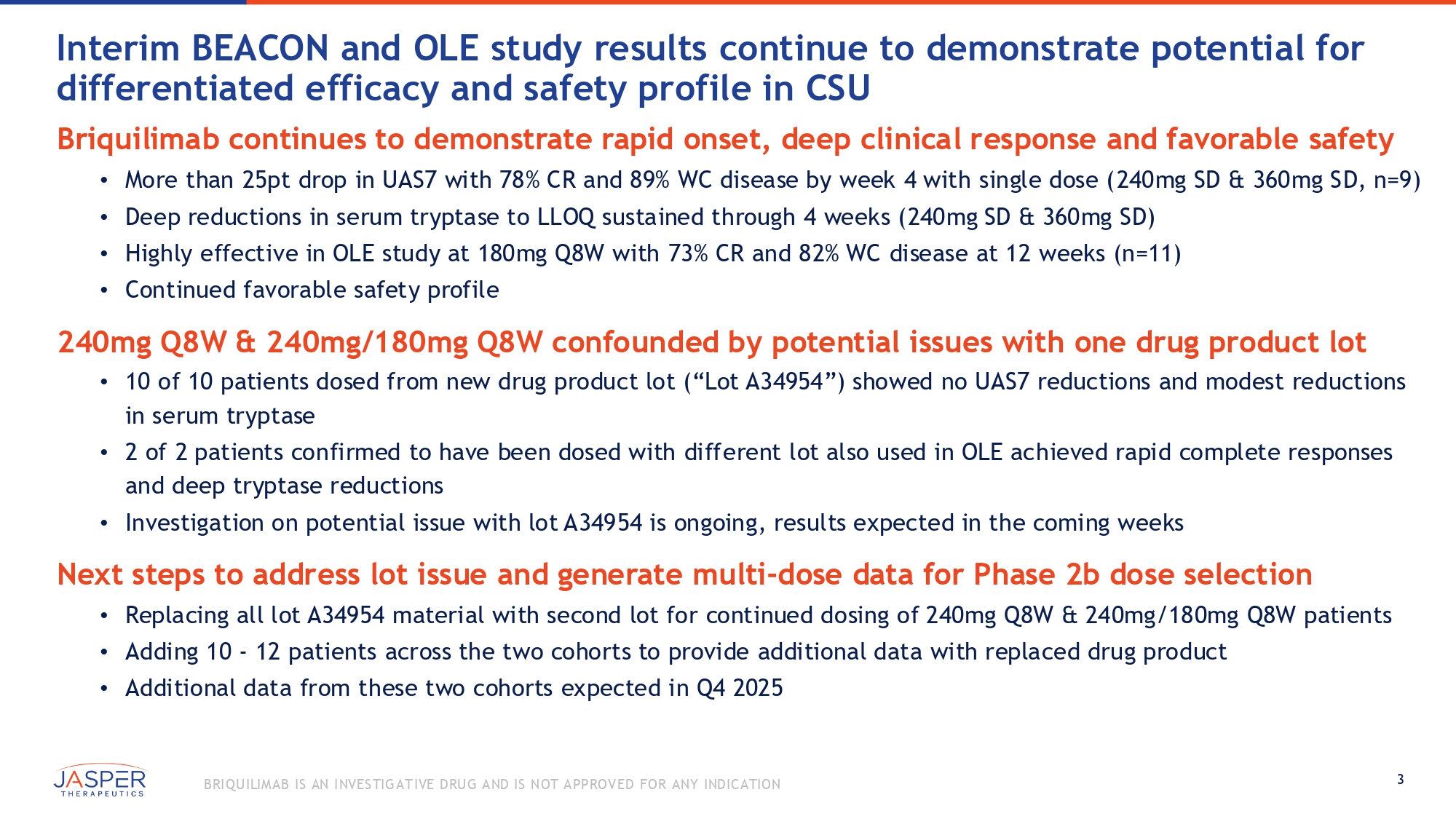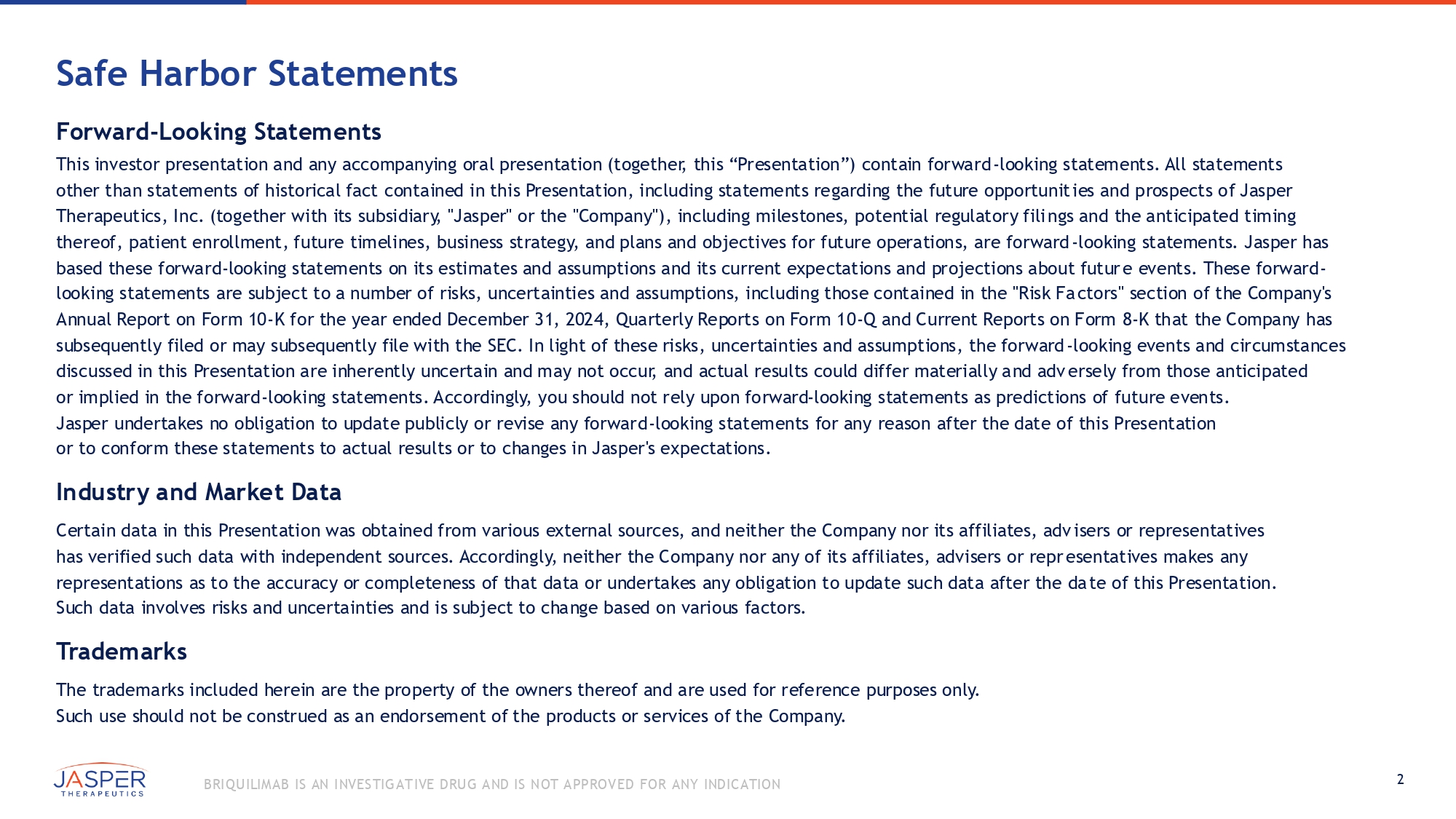 2 BRIQUILIMAB IS AN INVESTIGATIVE DRUG AND IS NOT APPROVED FOR ANY INDICATION Safe Harbor Statements Forward - Looking Statements This investor presentation and any accompanying oral presentation (together, this “Presentation”) contain forward - looking statem ents. All statements other than statements of historical fact contained in this Presentation, including statements regarding the future opportunit ies and prospects of Jasper Therapeutics, Inc. (together with its subsidiary, "Jasper" or the "Company"), including milestones, potential regulatory fili ngs and the anticipated timing thereof, patient enrollment, future timelines, business strategy, and plans and objectives for future operations, are forward - lo oking statements. Jasper has based these forward - looking statements on its estimates and assumptions and its current expectations and projections about futur e events. These forward - looking statements are subject to a number of risks, uncertainties and assumptions, including those contained in the "Risk Fa cto rs" section of the Company's Annual Report on Form 10 - K for the year ended December 31, 2024, Quarterly Reports on Form 10 - Q and Current Reports on Form 8 - K that the Company has subsequently filed or may subsequently file with the SEC. In light of these risks, uncertainties and assumptions, the forward - lo oking events and circumstances discussed in this Presentation are inherently uncertain and may not occur, and actual results could differ materially and adv ers ely from those anticipated or implied in the forward - looking statements. Accordingly, you should not rely upon forward - looking statements as predictions of future events. Jasper undertakes no obligation to update publicly or revise any forward - looking statements for any reason after the date of thi s Presentation or to conform these statements to actual results or to changes in Jasper's expectations. Industry and Market Data Certain data in this Presentation was obtained from various external sources, and neither the Company nor its affiliates, adv ise rs or representatives has verified such data with independent sources. Accordingly, neither the Company nor any of its affiliates, advisers or repr ese ntatives makes any representations as to the accuracy or completeness of that data or undertakes any obligation to update such data after the da te of this Presentation. Such data involves risks and uncertainties and is subject to change based on various factors. Trademarks The trademarks included herein are the property of the owners thereof and are used for reference purposes only. Such use should not be construed as an endorsement of the products or services of the Company.