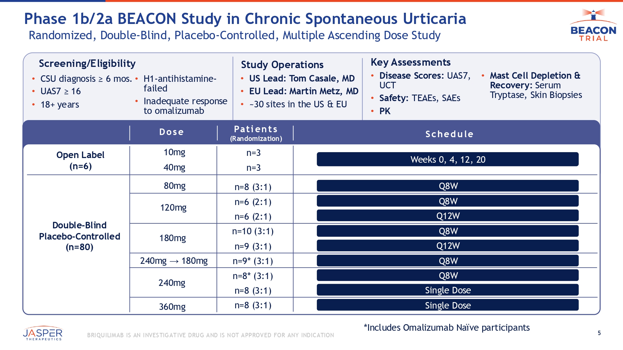 3 BRIQUILIMAB IS AN INVESTIGATIVE DRUG AND IS NOT APPROVED FOR ANY INDICATION Briquilimab continues to demonstrate rapid onset, deep clinical response and favorable safety • More than 25pt drop in UAS7 with 78% CR and 89% WC disease by week 4 with single dose ( 240mg SD & 360mg SD, n =9) • Deep reductions in serum tryptase to LLOQ sustained through 4 weeks ( 240mg SD & 360mg SD ) • Highly effective in OLE study at 180mg Q8W with 73 % CR and 82% WC disease at 12 weeks (n=11) • Continued favorable safety profile 240mg Q8W & 240mg/180mg Q8W confounded by potential issues with one drug product lot • 10 of 10 patients dosed from new dr ug product lot (“Lot A34954”) showed n o UAS7 reductions and modest reductions in serum tryptase • 2 of 2 patients confirmed to have been dosed with diff erent lot also used in OLE ac hieved rapid complete responses and deep tryptase reductions • Investigation on potential issue with lot A34954 is ongoing, results expected in the coming weeks Next steps to address lot issue and generate multi - dose data for Phase 2b dose selection • Replacing all lot A34954 material with second lot for continued dosing of 240mg Q8W & 240mg/180mg Q8W patients • Adding 10 - 12 patients across the two cohorts to provide additional data with replaced drug product • Additional data from these two cohorts expected in Q4 2025 Interim BEACON and OLE study results continue to demonstrate potential for differentiated efficacy and safety profile in CSU