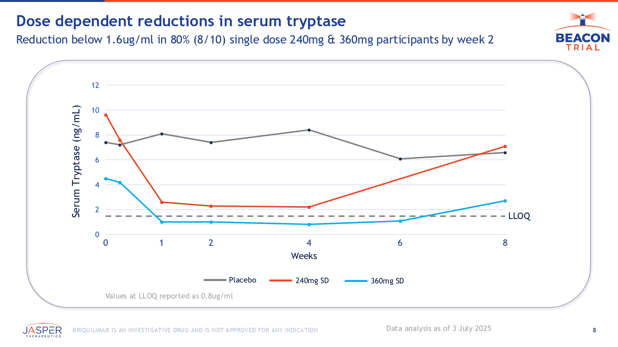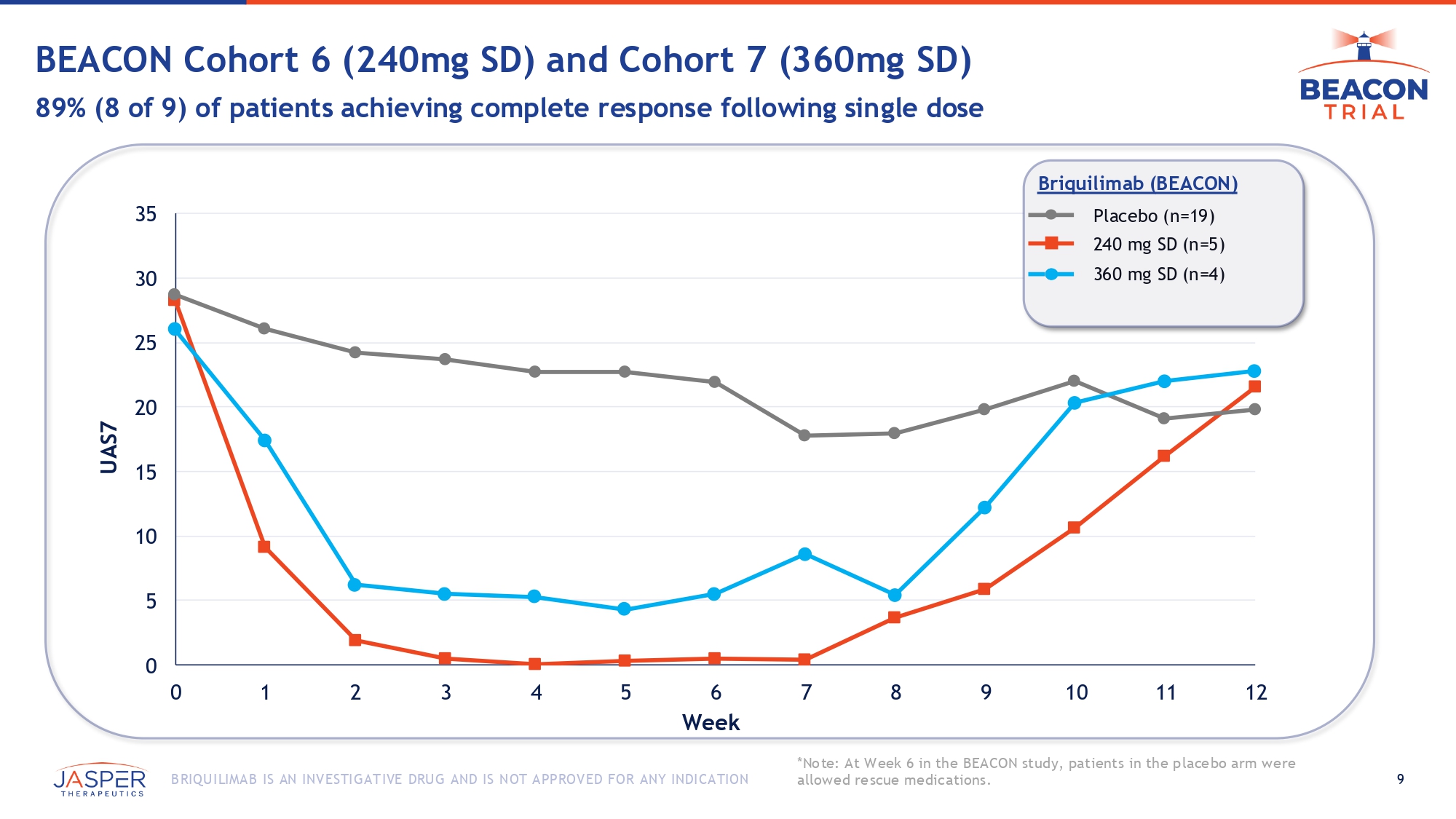 8 BRIQUILIMAB IS AN INVESTIGATIVE DRUG AND IS NOT APPROVED FOR ANY INDICATION Dose dependent reductions in serum tryptase Reduction below 1.6ug/ml in 80% (8/10) single dose 240mg & 360mg participants by week 2 Data analysis as of 3 July 2025 Weeks Serum Tryptase (ng/mL) LLOQ 0 2 4 6 8 10 12 0 1 2 4 6 8 240mg SD Placebo 36 0mg SD Values at LLOQ reported as 0.8ug/ml