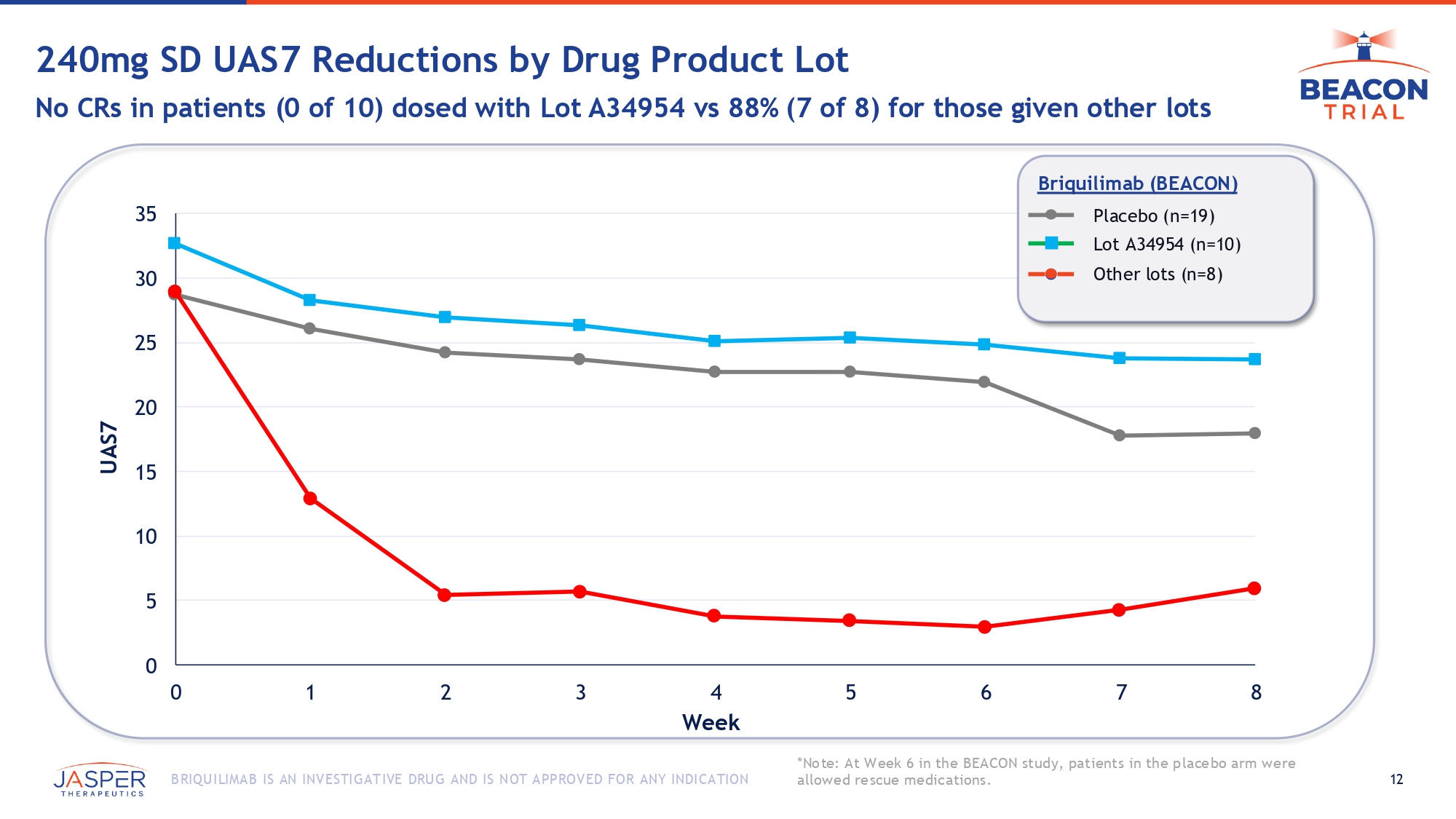11 BRIQUILIMAB IS AN INVESTIGATIVE DRUG AND IS NOT APPROVED FOR ANY INDICATION BEACON Multi - Dose Cohorts (240mg Q8W & 240mg/180mg Q8W) 240mg Q8W & 240mg/180mg Q8W confounded by potential issue with one drug product lot • 10 of 10 patients dosed from one drug product lot (“Lot A34954”) showed no UAS7 reductions and modest reductions in serum tryptase • 2 of 2 patients confirmed to have been dosed with different lot, also used in OLE study, achieved rapid complete responses and deep tryptase reductions • PK achieved reasonable levels across both cohorts, consistent with 240mg SD & 360mg SD patients • No new safety signals observed Next steps: • Investigation on potential issues with Lot A34954 is ongoing, results expected in the coming weeks • Shipping drug product from the second additional lot to sites for dosing 240mg Q8W & 240mg/180mg Q8W patients • Adding 10 - 12 patients across the two cohorts to provide additional data