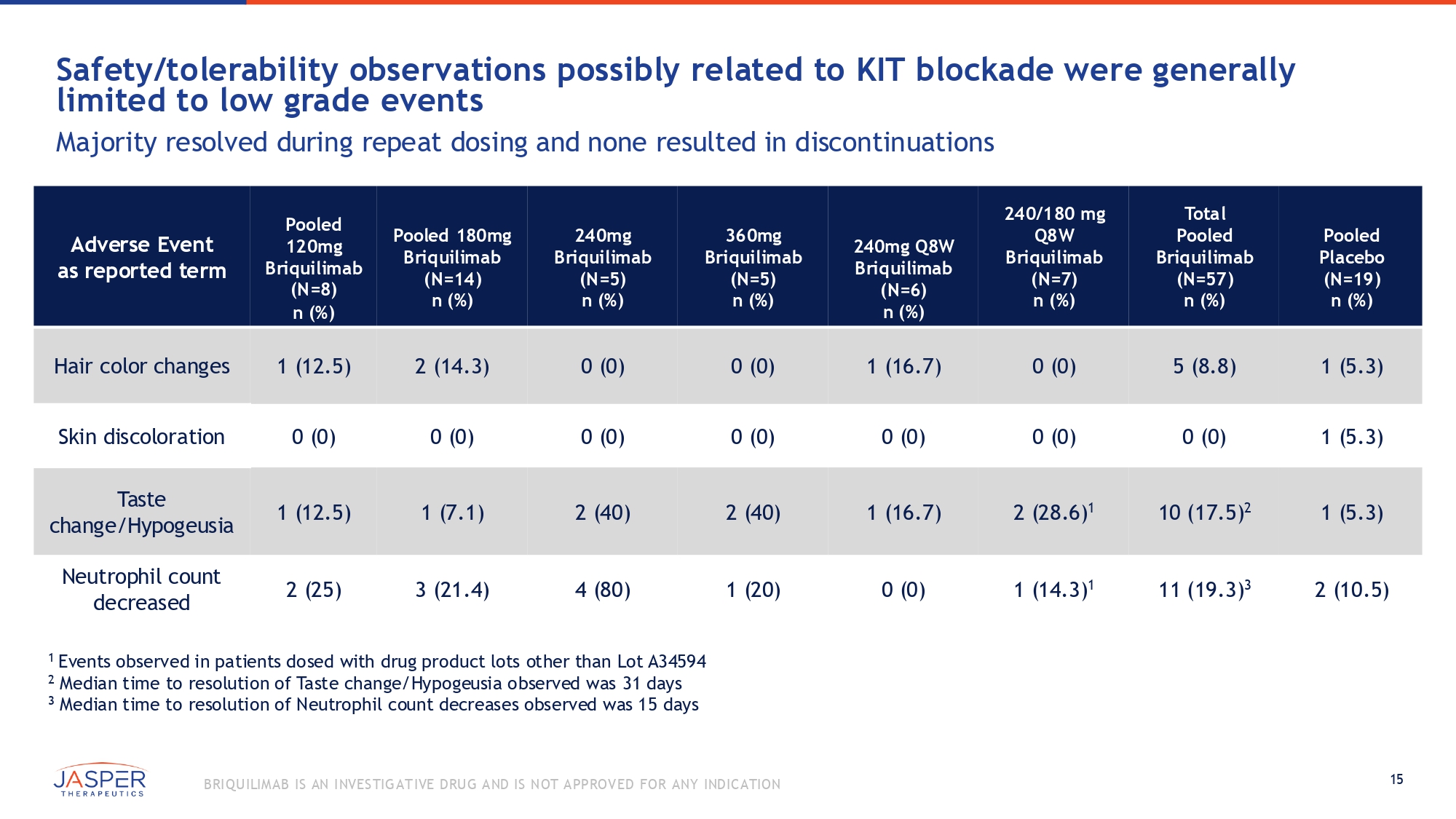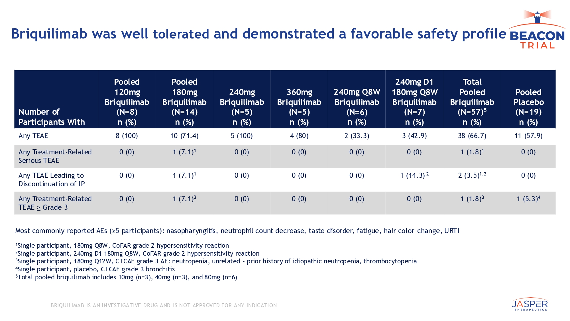 CONFIDENTIAL BRIQUILIMAB IS AN INVESTIGATIVE DRUG AND IS NOT APPROVED FOR ANY INDICATION Briquilimab was well tolerated and demonstrated a favorable safety profile Pooled Placebo (N=19) n (%) Total Pooled Briquilimab (N=57) 5 n (%) 240mg D1 180mg Q8W Briquilimab (N=7) n (%) 240mg Q8W Briquilimab (N=6) n (%) 360mg Briquilimab (N=5) n (%) 240mg Briquilimab (N=5) n (%) Pooled 180mg Briquilimab (N=14) n (%) Pooled 120mg Briquilimab (N=8) n (%) Number of Participants With 11 (57.9) 38 (66.7) 3 (42.9) 2 (33.3) 4 (80) 5 (100) 10 (71.4) 8 (100) Any TEAE 0 (0) 1 (1.8) 1 0 (0) 0 (0) 0 (0) 0 (0) 1 (7.1) 1 0 (0) Any Treatment - Related Serious TEAE 0 (0) 2 (3.5) 1,2 1 (14.3) 2 0 (0) 0 (0) 0 (0) 1 (7.1) 1 0 (0) Any TEAE Leading to Discontinuation of IP 1 (5.3) 4 1 (1.8) 3 0 (0) 0 (0) 0 (0) 0 (0) 1 (7.1) 3 0 (0) Any Treatment - Related TEAE > Grade 3 1 Single participant, 180mg Q8W, CoFAR grade 2 hypersensitivity reaction 2 Single participant, 240mg D1 180mg Q8W, CoFAR grade 2 hypersensitivity reaction 3 Single participant, 180mg Q12W, CTCAE grade 3 AE: neutropenia, unrelated - prior history of idiopathic neutropenia, thrombocytop enia 4 Single participant, placebo, CTCAE grade 3 bronchitis 5 Total pooled briquilimab includes 10mg (n=3), 40mg (n=3), and 80mg (n=6) Most commonly reported AEs (≥5 participants): nasopharyngitis, neutrophil count decrease, taste disorder, fatigue, hair color ch ange, URTI
