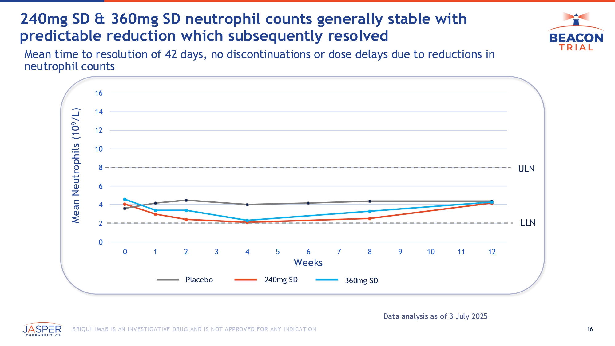 16 BRIQUILIMAB IS AN INVESTIGATIVE DRUG AND IS NOT APPROVED FOR ANY INDICATION 240mg SD & 360mg SD neutrophil counts generally stable with predictable reduction which subsequently resolved Mean time to resolution of 42 days, no discontinuations or dose delays due to reductions in neutrophil counts Data analysis as of 3 July 2025 0 2 4 6 8 10 12 14 16 0 1 2 3 4 5 6 7 8 9 10 11 12 360mg SD 240mg SD Weeks Mean Neutrophils (10 9 /L) Placebo ULN LLN
