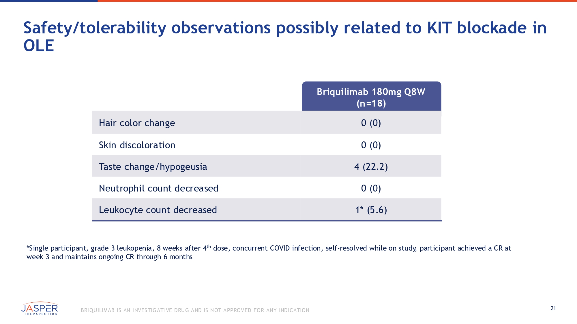 20 BRIQUILIMAB IS AN INVESTIGATIVE DRUG AND IS NOT APPROVED FOR ANY INDICATION Briquilimab was well tolerated and demonstrated a favorable safety profile in the OLE study Briquilimab 180mg Q8W (n=18) 16 (88) Any adverse event* 0 (0) Any serious adverse event 0 (0) Any adverse event leading to discontinuation 0 (0) Adverse event leading to death 1** (5.5) Adverse event ≥ grade 3 *AEs occurring in ≥1 participant: COVID - 19, dizziness , ear pain, gastroesophageal reflux, nausea, pneumonia ** Single participant, grade 3 leukopenia, 8 weeks after 4 th dose, concurrent COVID infection, self - resolved while on study, participant achieved a CR at week 3 and maintains ongoing CR through 6 months