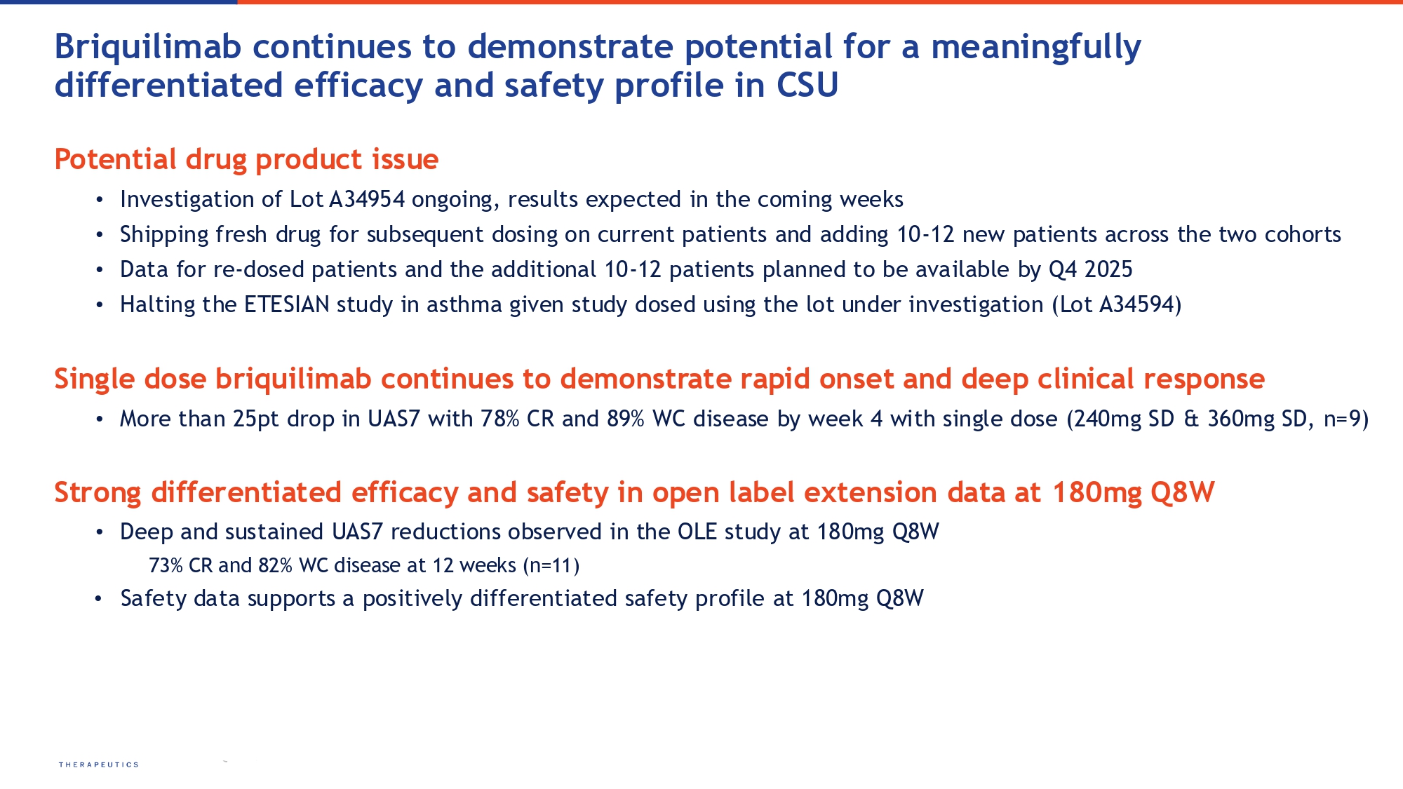 23 BRIQUILIMAB IS AN INVESTIGATIVE DRUG AND IS NOT APPROVED FOR ANY INDICATION Potential drug product issue • Investigation of Lot A34954 ongoing, results expected in the coming weeks • Shipping fresh drug for subsequent dosing on current patients and adding 10 - 12 new patients across the two cohorts • Data for re - dosed patients and the additional 10 - 12 patients planned to be available by Q4 2025 • Halting the ETESIAN study in asthma given study dosed using the lot under investigation (Lot A34594) Single dose briquilimab continues to demonstrate rapid onset and deep clinical response • More than 25pt drop in UAS7 with 78% CR and 89% WC disease by week 4 with single dose (240mg SD & 360mg SD, n=9) Strong differentiated efficacy and safety in open label extension data at 180mg Q8W • Deep and sustained UAS7 reductions observed in the OLE study at 180mg Q8W 73% CR and 82% WC disease at 12 weeks (n=11) • Safety data supports a positively differentiated safety profile at 180mg Q8W Briquilimab continues to demonstrate potential for a meaningfully differentiated efficacy and safety profile in CSU
