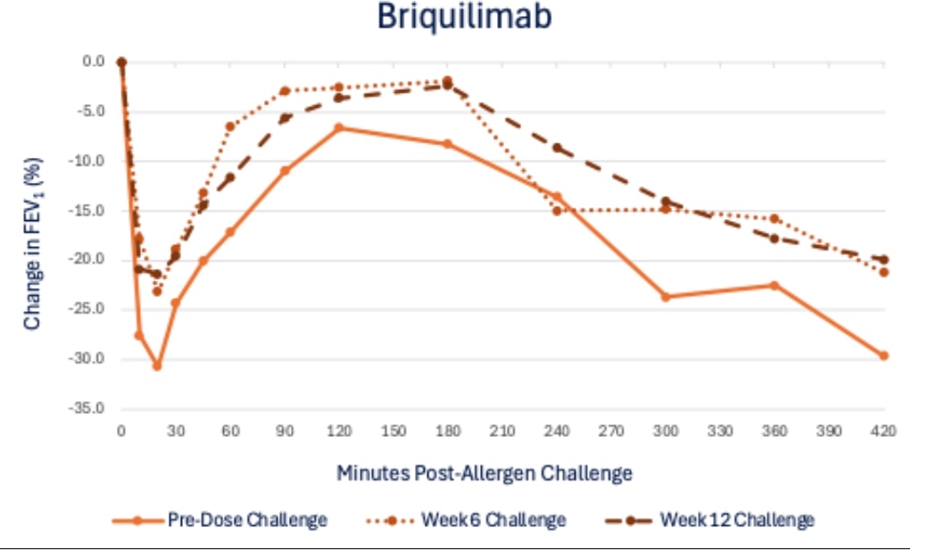 The preliminary data includes the results from 14 participants, 8 receiving a single dose of 180mg briquilimab and 6 receiving placebo, who completed at least 6 weeks of allergen challenge testing following initial dosing with investigational product. Compared to baseline, briquilimab reduced the allergen induced LAR (measured by the mean maximum percentage fall in FEV1 (%Max FEV1) and fall in area under the FEV1 time response curve (AUC)) at both 6 and 12 weeks. Patients who received briquilimab showed an improvement in the LAR %Max FEV1 of 10.4% at 6 weeks and 8.7% at 12 weeks compared to baseline and an improvement in the LAR AUC of 25.4% at 6 weeks and 23.3% at 12 weeks.