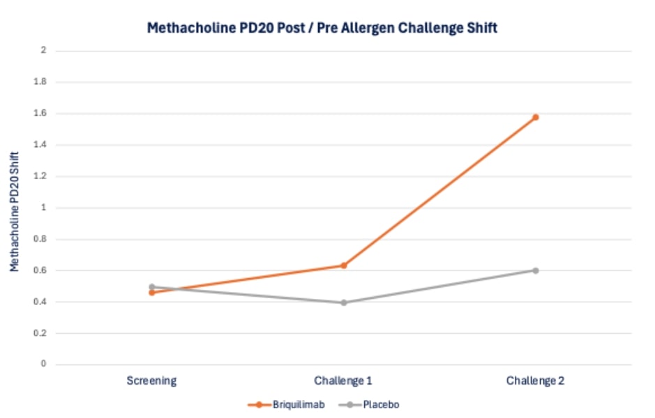 Patient airway hyperresponsiveness was also assessed pre- and post-allergen challenge by methacholine PD20. At baseline, prior to administration of briquilimab, patients randomized to both the placebo group and the briquilimab group had similar drops in the ratio of post- to pre-allergen challenge methacholine PD20 (dose of methacholine required to drive a 20% decrease in FEV1) following allergen challenge of 0.50 and 0.46, respectively. At the week 6 challenge the shift in the methacholine PD20 response was 0.40 for placebo and 0.63 for briquilimab and at the week 12 challenge the shift was 0.60 for placebo and 1.58 for briquilimab indicating an increased resistance to methacholine following allergen in patients dosed with briquilimab.