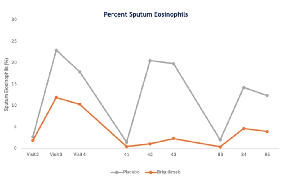 Treatment with briquilimab also decreased levels of sputum eosinophils before and after allergen challenge. Patients in the briquilimab group had reduced mean sputum eosinophil levels at pre allergen challenge timepoints of 1.88% at baseline to 0.44% at day 41 and 0.38% at day 83. Briquilimab also reduced mean sputum eosinophil levels 24 hours following allergen challenge. At baseline, prior to briquilimab dosing, patients randomized to the briquilimab group had a 24-hour post allergen challenge eosinophil level of 10.3%. Following dosing of briquilimab the 24-hour post allergen challenge eosinophil level was 2.32% at 6 weeks and 3.98% at 12 weeks.