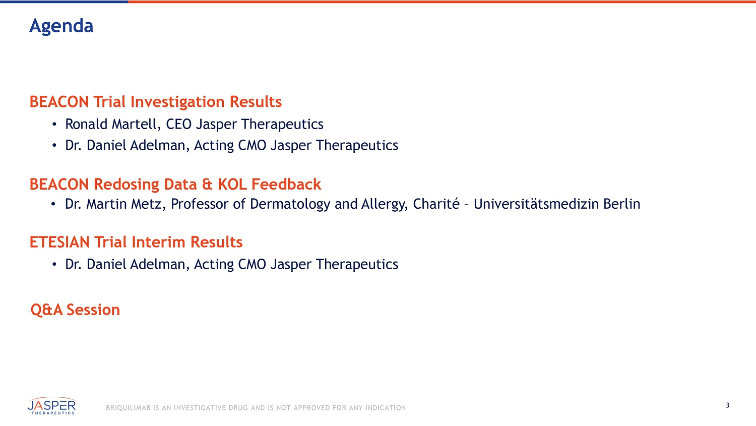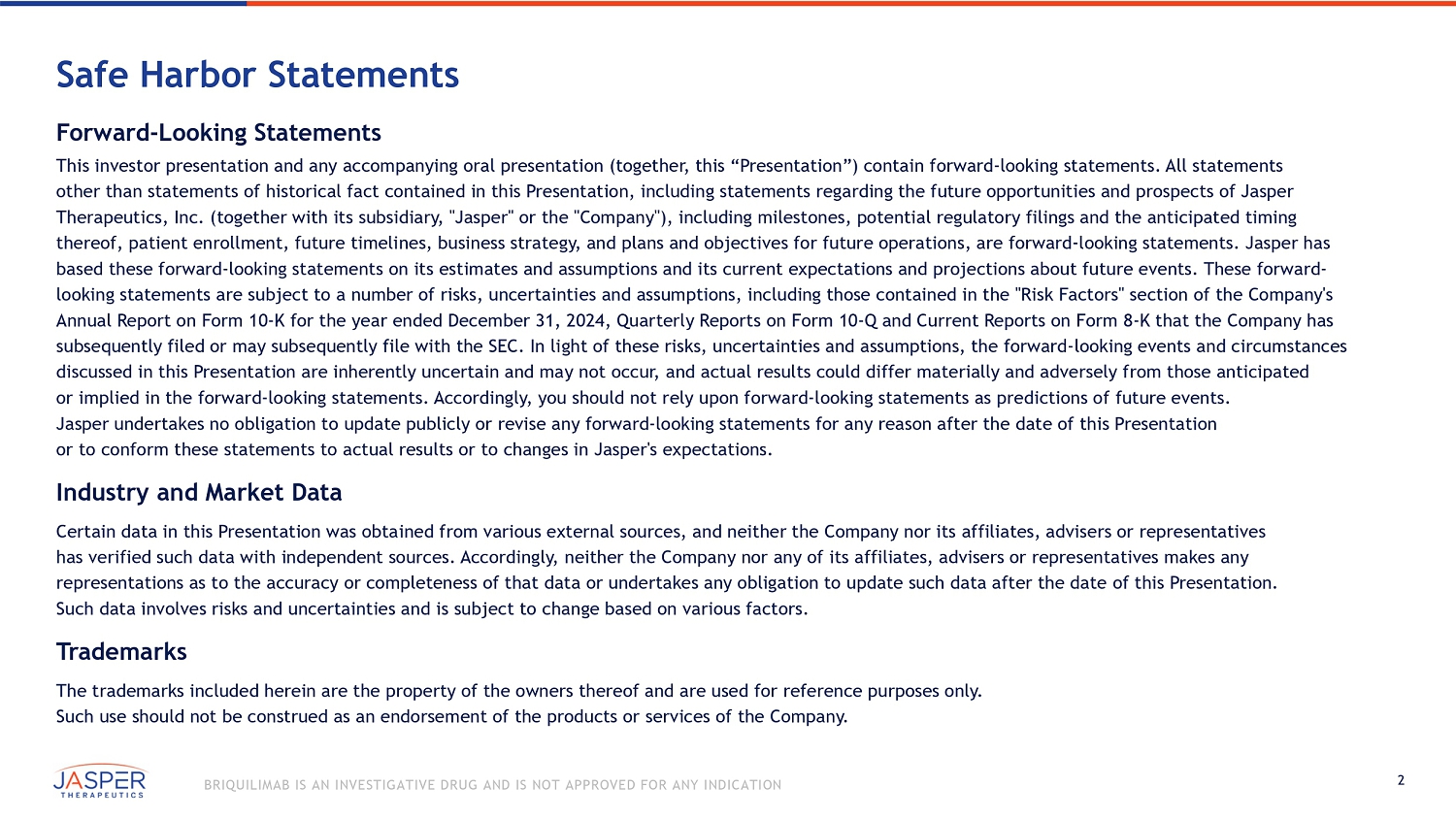 2 BRIQUILIMAB IS AN INVESTIGATIVE DRUG AND IS NOT APPROVED FOR ANY INDICATION Safe Harbor Statements Forward - Looking Statements This investor presentation and any accompanying oral presentation (together, this “Presentation”) contain forward - looking statem ents. All statements other than statements of historical fact contained in this Presentation, including statements regarding the future opportunit ies and prospects of Jasper Therapeutics, Inc. (together with its subsidiary, "Jasper" or the "Company"), including milestones, potential regulatory fili ngs and the anticipated timing thereof, patient enrollment, future timelines, business strategy, and plans and objectives for future operations, are forward - lo oking statements. Jasper has based these forward - looking statements on its estimates and assumptions and its current expectations and projections about futur e events. These forward - looking statements are subject to a number of risks, uncertainties and assumptions, including those contained in the "Risk Fa cto rs" section of the Company's Annual Report on Form 10 - K for the year ended December 31, 2024, Quarterly Reports on Form 10 - Q and Current Reports on Form 8 - K that the Company has subsequently filed or may subsequently file with the SEC. In light of these risks, uncertainties and assumptions, the forward - lo oking events and circumstances discussed in this Presentation are inherently uncertain and may not occur, and actual results could differ materially and adv ers ely from those anticipated or implied in the forward - looking statements. Accordingly, you should not rely upon forward - looking statements as predictions of future events. Jasper undertakes no obligation to update publicly or revise any forward - looking statements for any reason after the date of thi s Presentation or to conform these statements to actual results or to changes in Jasper's expectations. Industry and Market Data Certain data in this Presentation was obtained from various external sources, and neither the Company nor its affiliates, adv ise rs or representatives has verified such data with independent sources. Accordingly, neither the Company nor any of its affiliates, advisers or repr ese ntatives makes any representations as to the accuracy or completeness of that data or undertakes any obligation to update such data after the da te of this Presentation. Such data involves risks and uncertainties and is subject to change based on various factors. Trademarks The trademarks included herein are the property of the owners thereof and are used for reference purposes only. Such use should not be construed as an endorsement of the products or services of the Company.