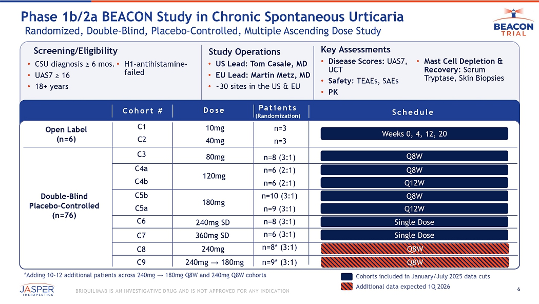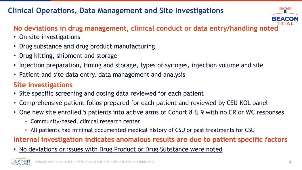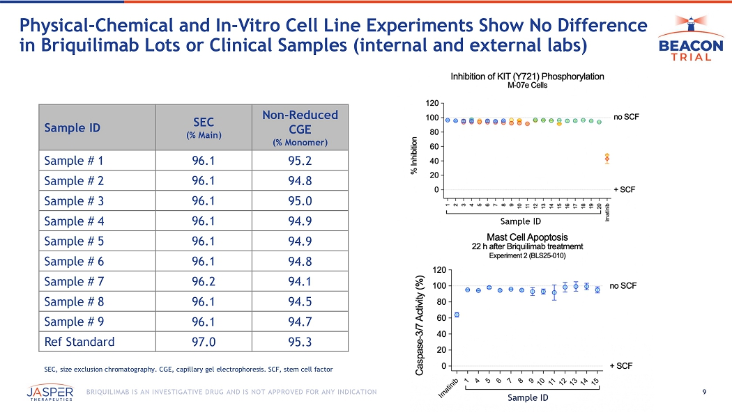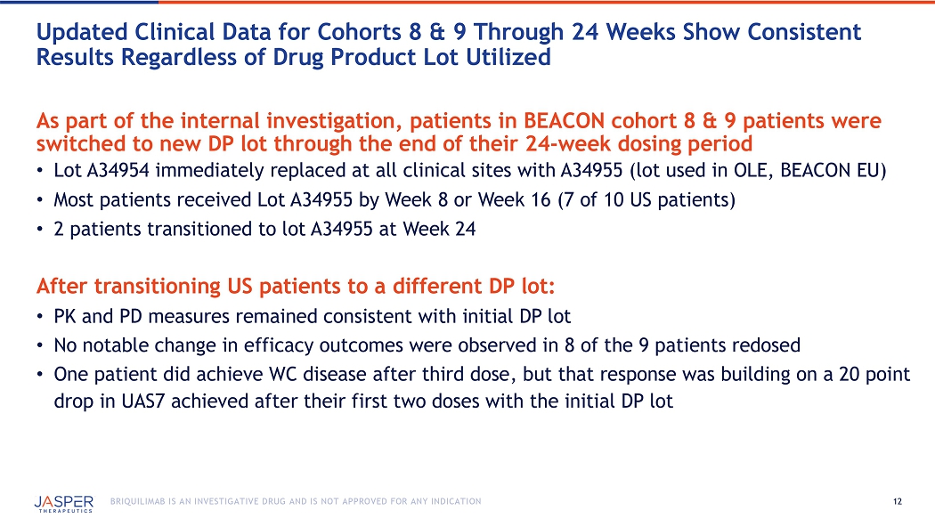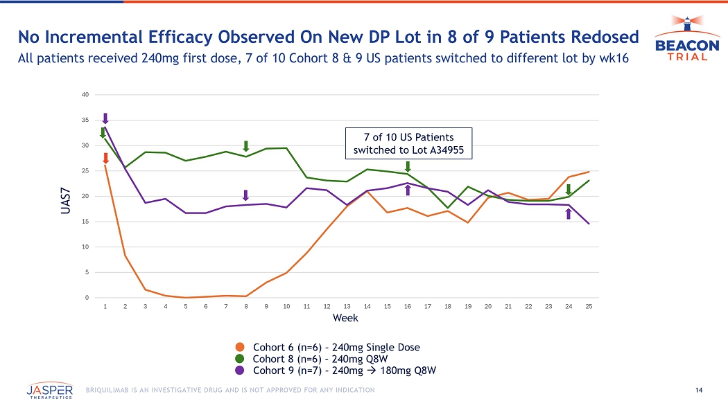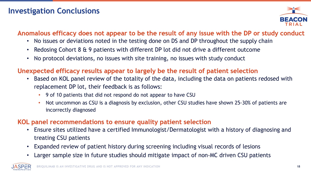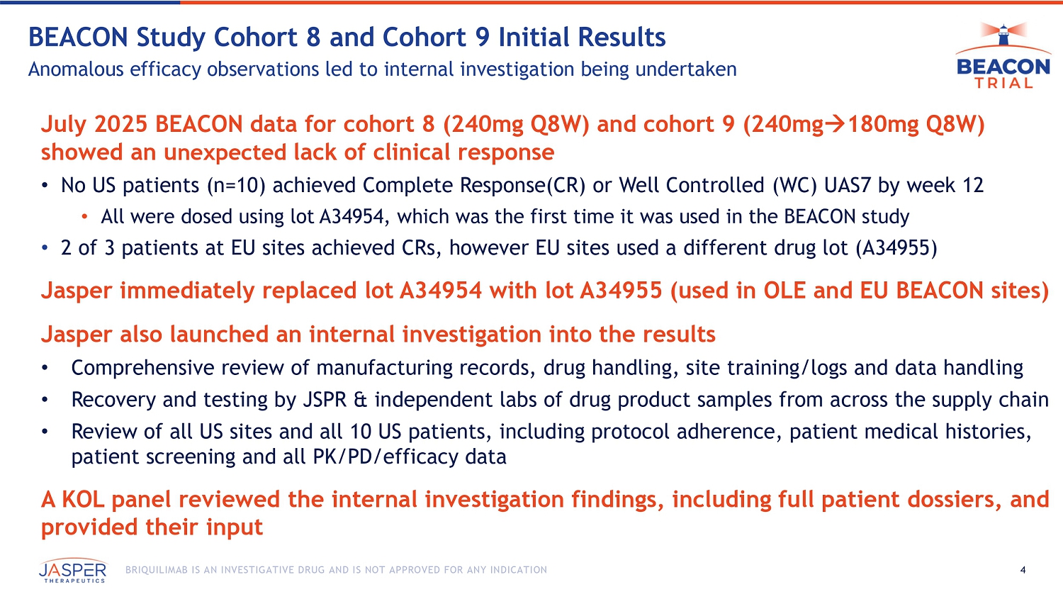 4 BRIQUILIMAB IS AN INVESTIGATIVE DRUG AND IS NOT APPROVED FOR ANY INDICATION BEACON Study Cohort 8 and Cohort 9 Initial Results Anomalous efficacy observations led to internal investigation being undertaken July 2025 BEACON data for cohort 8 (240mg Q8W) and cohort 9 (240mg  180mg Q8W) showed an u nexpected lack of clinical response • No US patients (n=10) achieved Complete Response(CR) or Well Controlled (WC) UAS7 by week 12 • All were dosed using lot A34954, which was the first time it was used in the BEACON study • 2 of 3 patients at EU sites achieved CRs, however EU sites used a different drug lot (A34955) Jasper immediately replaced lot A34954 with lot A34955 (used in OLE and EU BEACON sites) Jasper also launched an internal investigation into the results • Comprehensive review of manufacturing records, drug handling, site training/logs and data handling • Recovery and testing by JSPR & independent labs of drug product samples from across the supply chain • Review of all US sites and all 10 US patients, including protocol adherence, patient medical histories, patient screening and all PK/PD/efficacy data A KOL panel reviewed the internal investigation findings, including full patient dossiers, and provided their input