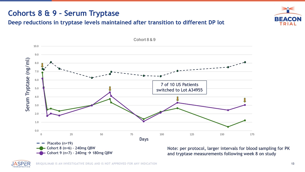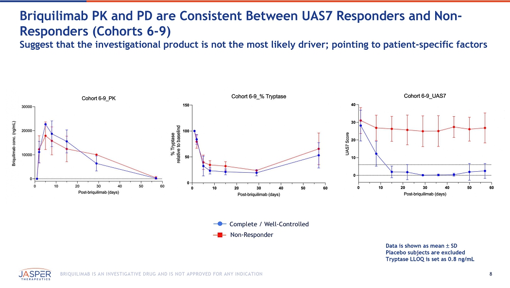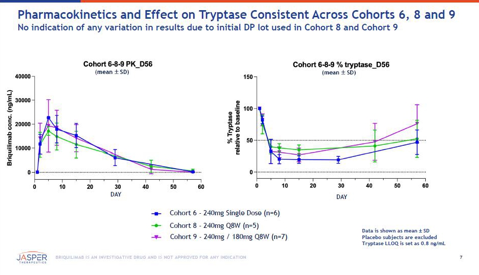 7 BRIQUILIMAB IS AN INVESTIGATIVE DRUG AND IS NOT APPROVED FOR ANY INDICATION Pharmacokinetics and Effect on Tryptase Consistent Across Cohorts 6, 8 and 9 No indication of any variation in results due to initial DP lot used in Cohort 8 and Cohort 9 (mean  SD) DAY Cohort 6 - 240mg Single Dose (n=6) Cohort 8 - 240mg Q8W (n=5) Cohort 9 - 240mg / 180mg Q8W (n=7) (mean  SD) DAY Data is shown as mean  SD Placebo subjects are excluded Tryptase LLOQ is set as 0.8 ng/mL0