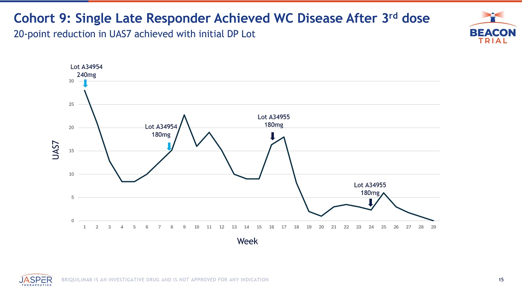 14 BRIQUILIMAB IS AN INVESTIGATIVE DRUG AND IS NOT APPROVED FOR ANY INDICATION No Incremental Efficacy Observed On New DP Lot in 8 of 9 Patients Redosed All patients received 240mg first dose, 7 of 10 Cohort 8 & 9 US patients switched to different lot by wk16 0 5 10 15 20 25 30 35 40 1 2 3 4 5 6 7 8 9 10 11 12 13 14 15 16 17 18 19 20 21 22 23 24 25 Week UAS7 7 of 10 US Patients switched to Lot A34955 Cohort 8 (n=6) – 240mg Q8W Cohort 9 (n=7) – 240mg  180mg Q8W Cohort 6 (n=6) – 240mg Single Dose