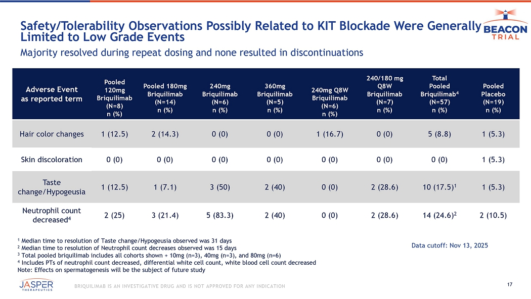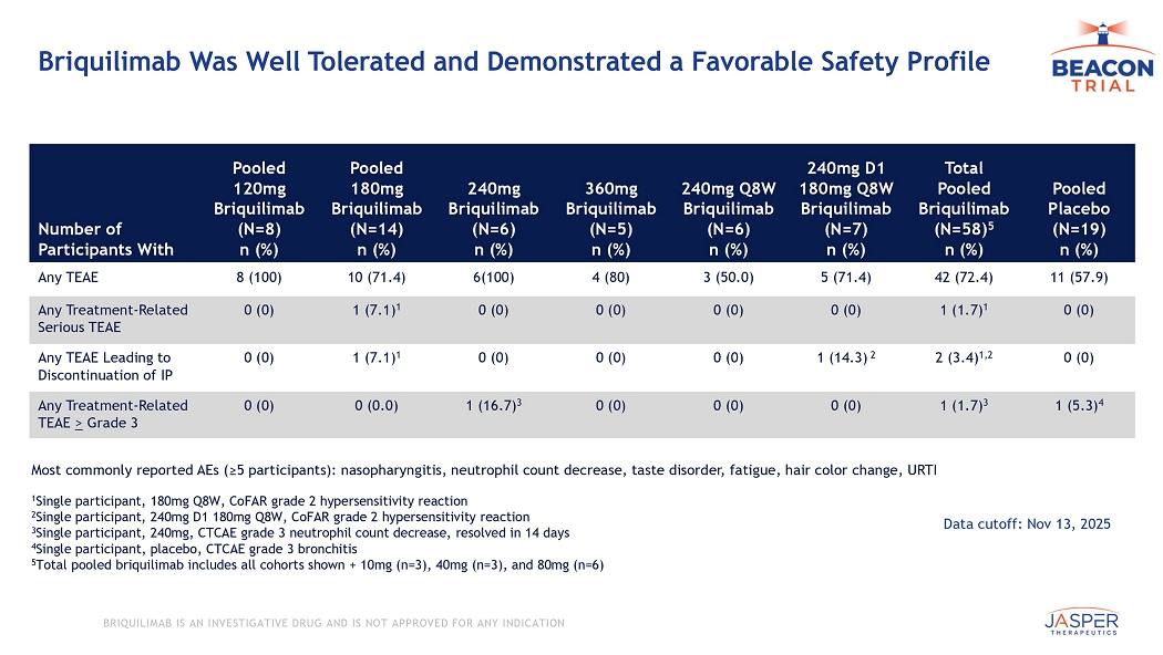 CONFIDENTIAL BRIQUILIMAB IS AN INVESTIGATIVE DRUG AND IS NOT APPROVED FOR ANY INDICATION Briquilimab Was Well Tolerated and Demonstrated a Favorable Safety Profile Pooled Placebo (N=19) n (%) Total Pooled Briquilimab (N=58) 5 n (%) 240mg D1 180mg Q8W Briquilimab (N=7) n (%) 240mg Q8W Briquilimab (N=6) n (%) 360mg Briquilimab (N=5) n (%) 240mg Briquilimab (N=6) n (%) Pooled 180mg Briquilimab (N=14) n (%) Pooled 120mg Briquilimab (N=8) n (%) Number of Participants With 11 (57.9) 42 (72.4) 5 (71.4) 3 (50.0) 4 (80) 6(100) 10 (71.4) 8 (100) Any TEAE 0 (0) 1 (1.7) 1 0 (0) 0 (0) 0 (0) 0 (0) 1 (7.1) 1 0 (0) Any Treatment - Related Serious TEAE 0 (0) 2 (3.4) 1,2 1 (14.3) 2 0 (0) 0 (0) 0 (0) 1 (7.1) 1 0 (0) Any TEAE Leading to Discontinuation of IP 1 (5.3) 4 1 (1.7) 3 0 (0) 0 (0) 0 (0) 1 (16.7) 3 0 (0.0) 0 (0) Any Treatment - Related TEAE > Grade 3 1 Single participant, 180mg Q8W, CoFAR grade 2 hypersensitivity reaction 2 Single participant, 240mg D1 180mg Q8W, CoFAR grade 2 hypersensitivity reaction 3 Single participant, 240 mg, CTCAE grade 3 neutrophil count decrease, resolved in 14 days 4 Single participant, placebo, CTCAE grade 3 bronchitis 5 Total pooled briquilimab includes all cohorts shown + 10mg (n=3), 40mg (n=3), and 80mg (n=6) Most commonly reported AEs (≥5 participants): nasopharyngitis, neutrophil count decrease, taste disorder, fatigue, hair color ch ange, URTI Data cutoff: Nov 13, 2025