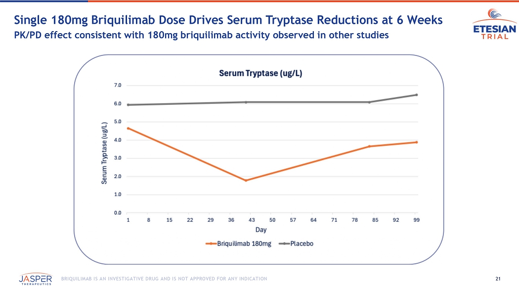20 BRIQUILIMAB IS AN INVESTIGATIVE DRUG AND IS NOT APPROVED FOR ANY INDICATION Allergen Challenge & Methacholine PD20 Measured at 6 weeks and 12 weeks Briquilimab Phase 1b/2a ETESIAN Study in Allergic A sthma Double - blind, placebo - controlled, single dose, challenge study n=17 (1:1) 180 mg (Single Dose) Dose Timeline Patients (Randomization) Day 0 Week 12 Week 6 Allergen Challenge Allergen Challenge Week 14 Safety Follow - Up Week - 2 Dosing Screening/Eligibility • Diagnosis of stable allergic asthma • Baseline FEV 1 70% of predicted value • Positive methacholine challenge at baseline • 18 - 65 years of age Study Operations • Lead Investigator: Paul O’Byrne, MD • 6 centers in Canada • N = 17 patients • Study terminated early for administrative reasons Key Assessments • Early & Late Asthmatic Response: % decrease in FEV 1 from baseline • Changes in Airway Hyperresponsiveness: Methacholine PD20 24 hours after allergen challenge • Mast Cell Depletion & Recovery: Serum Tryptase • Safety: TEAEs, SAEs
