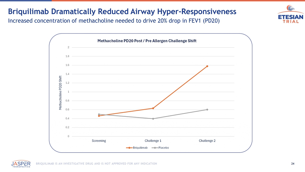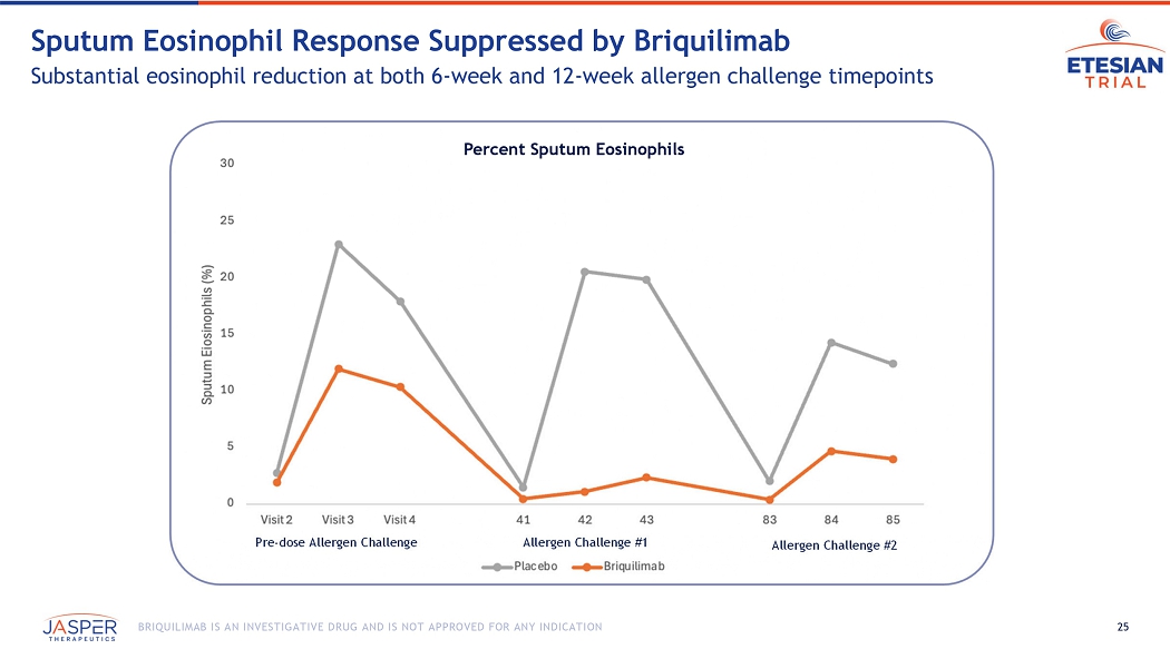 24 BRIQUILIMAB IS AN INVESTIGATIVE DRUG AND IS NOT APPROVED FOR ANY INDICATION Briquilimab Dramatically Reduced Airway Hyper - Responsiveness Increased concentration of methacholine needed to drive 20% drop in FEV1 (PD20) 0 0.2 0.4 0.6 0.8 1 1.2 1.4 1.6 1.8 2 Screening Challenge 1 Challenge 2 Methacholine PD20 Shift Methacholine PD20 Post / Pre Allergen Challenge Shift Briquilimab Placebo