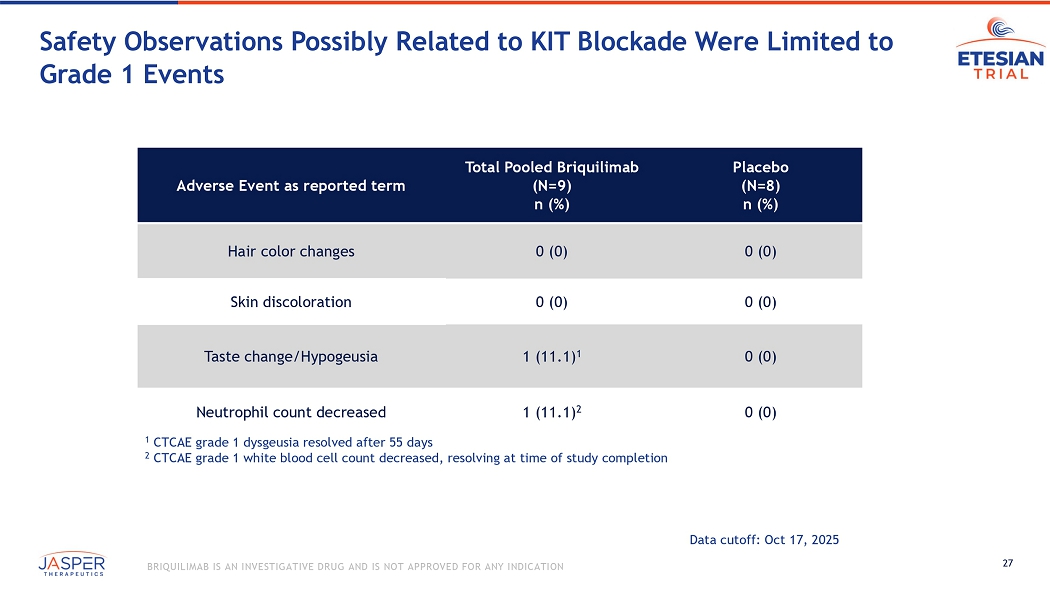 26 BRIQUILIMAB IS AN INVESTIGATIVE DRUG AND IS NOT APPROVED FOR ANY INDICATION Preliminary Data Shows Briquilimab Was Well Tolerated with a Favorable Safety Profile in the ETESIAN Study Placebo (N=8) n (%) Briquilimab 180mg Single Dose (N=9) n (%) Number of Participants With 3 (37.5) 5 (55.6) Any TEAE 0 (0) 0 (0) Any Serious Treatment - Related TEAE 0 (0) 0 (0) Any TEAE Leading to Discontinuation of IP 0 (0) 0 (0) Any Treatment - Related TEAE > Grade 3 A single placebo subject had an unrelated hypersensitivity reaction, CoFAR grade 2 A single briquilimab subject had related rash and pruritus, both CoFAR grade 1 Data cutoff: Oct 17, 2025