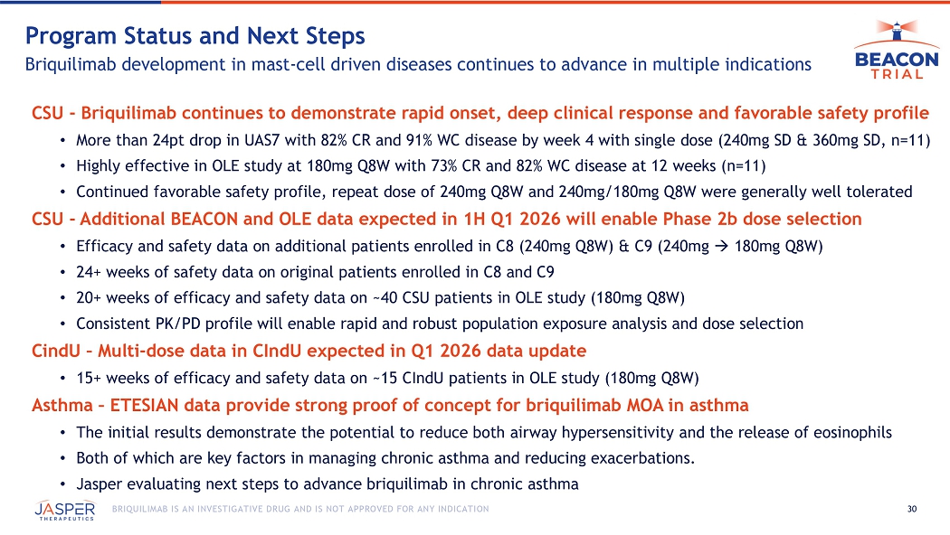 30 BRIQUILIMAB IS AN INVESTIGATIVE DRUG AND IS NOT APPROVED FOR ANY INDICATION Program Status and Next Steps Briquilimab development in mast - cell driven diseases continues to advance in multiple indications CSU - Briquilimab continues to demonstrate rapid onset, deep clinical response and favorable safety profile • More than 24pt drop in UAS7 with 82% CR and 91% WC disease by week 4 with single dose (240mg SD & 360mg SD, n=11) • Highly effective in OLE study at 180mg Q8W with 73% CR and 82% WC disease at 12 weeks (n=11) • Continued favorable safety profile, r epeat dose of 240mg Q8W and 240mg/180mg Q8W were generally well tolerated CSU - Additional BEACON and OLE data expected in 1H Q1 2026 will enable Phase 2b dose selection • Efficacy and safety data on additional patients enrolled in C8 (240mg Q8W) & C9 (240mg  180mg Q8W) • 24+ weeks of safety data on original patients enrolled in C8 and C9 • 20+ weeks of efficacy and safety data on ~40 CSU patients in OLE study (180mg Q8W) • Consistent PK/PD profile will enable rapid and robust population exposure analysis and dose selection CindU – Multi - dose data in CIndU expected in Q1 2026 data update • 15+ weeks of efficacy and safety data on ~15 CIndU patients in OLE study (180mg Q8W) Asthma – ETESIAN data provide strong proof of concept for briquilimab MOA in asthma • The initial results demonstrate the potential to reduce both airway hypersensitivity and the release of eosinophils • Both of which are key factors in managing chronic asthma and reducing exacerbations. • Jasper evaluating next steps to advance briquilimab in chronic asthma