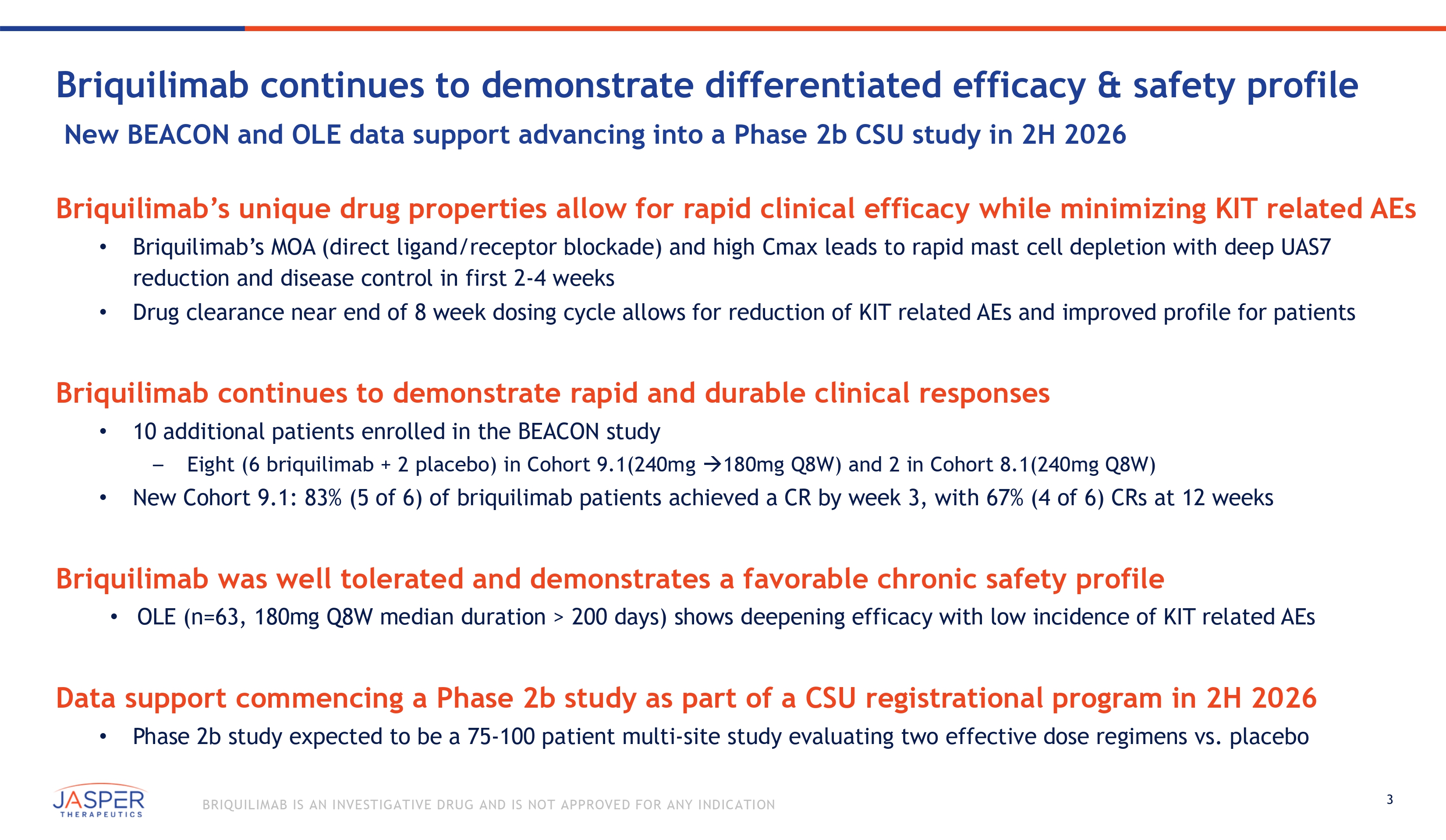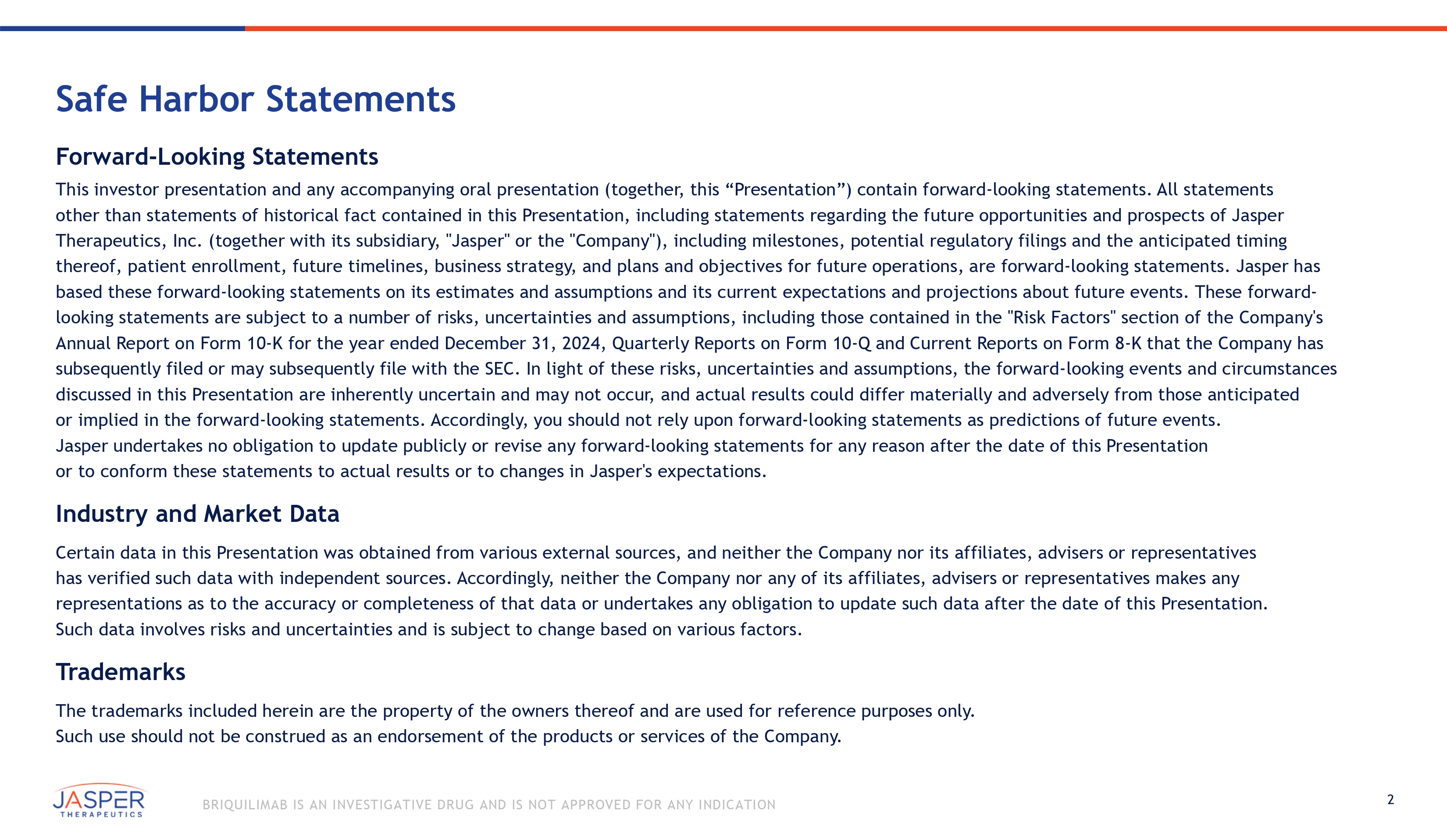 2 BRIQUILIMAB IS AN INVESTIGATIVE DRUG AND IS NOT APPROVED FOR ANY INDICATION Safe Harbor Statements Forward - Looking Statements This investor presentation and any accompanying oral presentation (together, this “Presentation”) contain forward - looking statements. All statements other than statements of historical fact contained in this Presentation, including statements regarding the future opportunities and prospects of Jasper Therapeutics, Inc. (together with its subsidiary, "Jasper" or the "Company"), including milestones, potential regulatory filings and the anticipated timing thereof, patient enrollment, future timelines, business strategy, and plans and objectives for future operations, are forward - looking statements. Jasper has based these forward - looking statements on its estimates and assumptions and its current expectations and projections about future events. These forward - looking statements are subject to a number of risks, uncertainties and assumptions, including those contained in the "Risk Factors" section of the Company's Annual Report on Form 10 - K for the year ended December 31, 2024, Quarterly Reports on Form 10 - Q and Current Reports on Form 8 - K that the Company has subsequently filed or may subsequently file with the SEC. In light of these risks, uncertainties and assumptions, the forward - looking events and circumstances discussed in this Presentation are inherently uncertain and may not occur, and actual results could differ materially and adversely from those anticipated or implied in the forward - looking statements. Accordingly, you should not rely upon forward - looking statements as predictions of future events. Jasper undertakes no obligation to update publicly or revise any forward - looking statements for any reason after the date of this Presentation or to conform these statements to actual results or to changes in Jasper's expectations. Industry and Market Data Certain data in this Presentation was obtained from various external sources, and neither the Company nor its affiliates, advisers or representatives has verified such data with independent sources. Accordingly, neither the Company nor any of its affiliates, advisers or representatives makes any representations as to the accuracy or completeness of that data or undertakes any obligation to update such data after the date of this Presentation. Such data involves risks and uncertainties and is subject to change based on various factors. Trademarks The trademarks included herein are the property of the owners thereof and are used for reference purposes only. Such use should not be construed as an endorsement of the products or services of the Company.