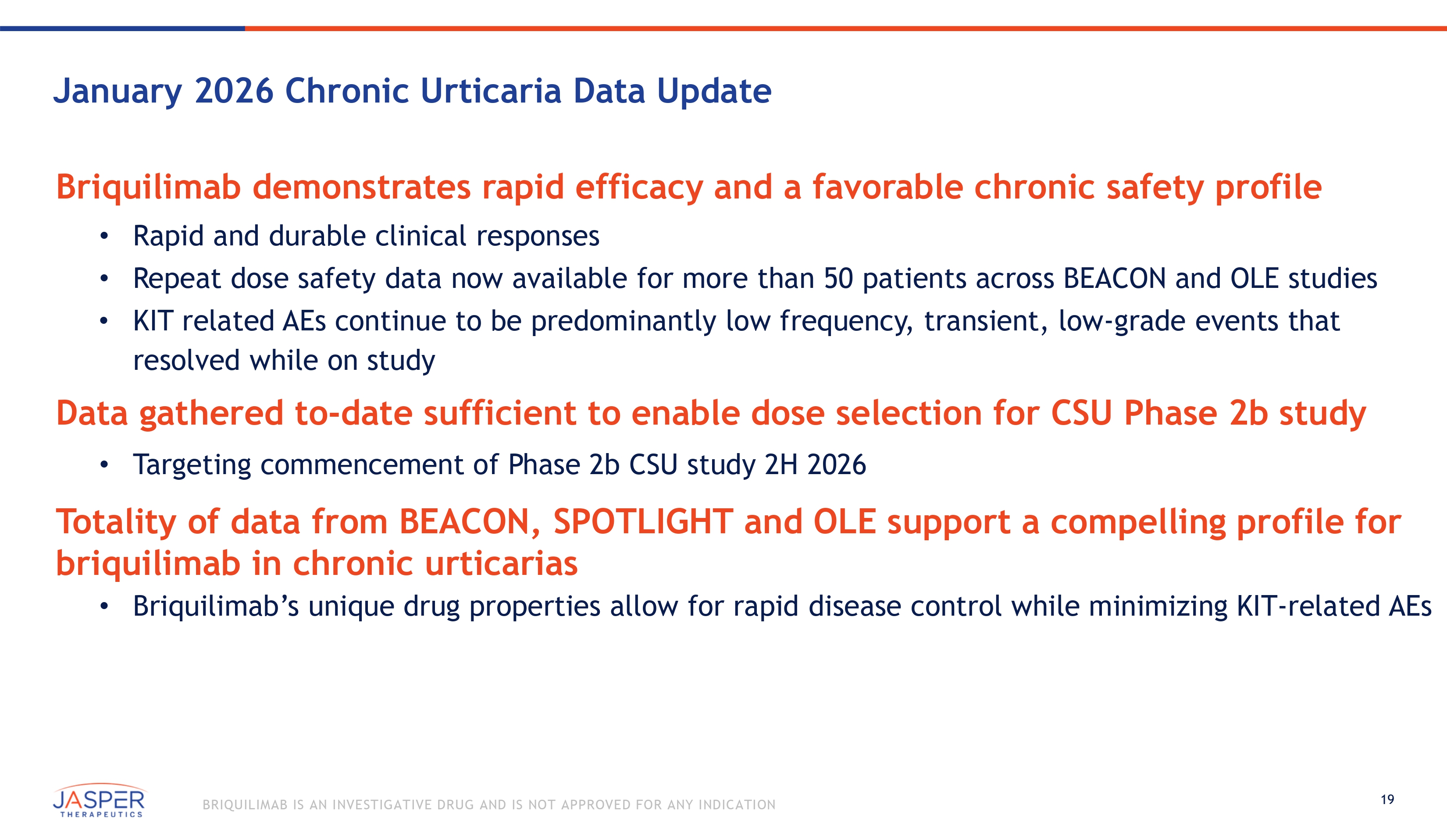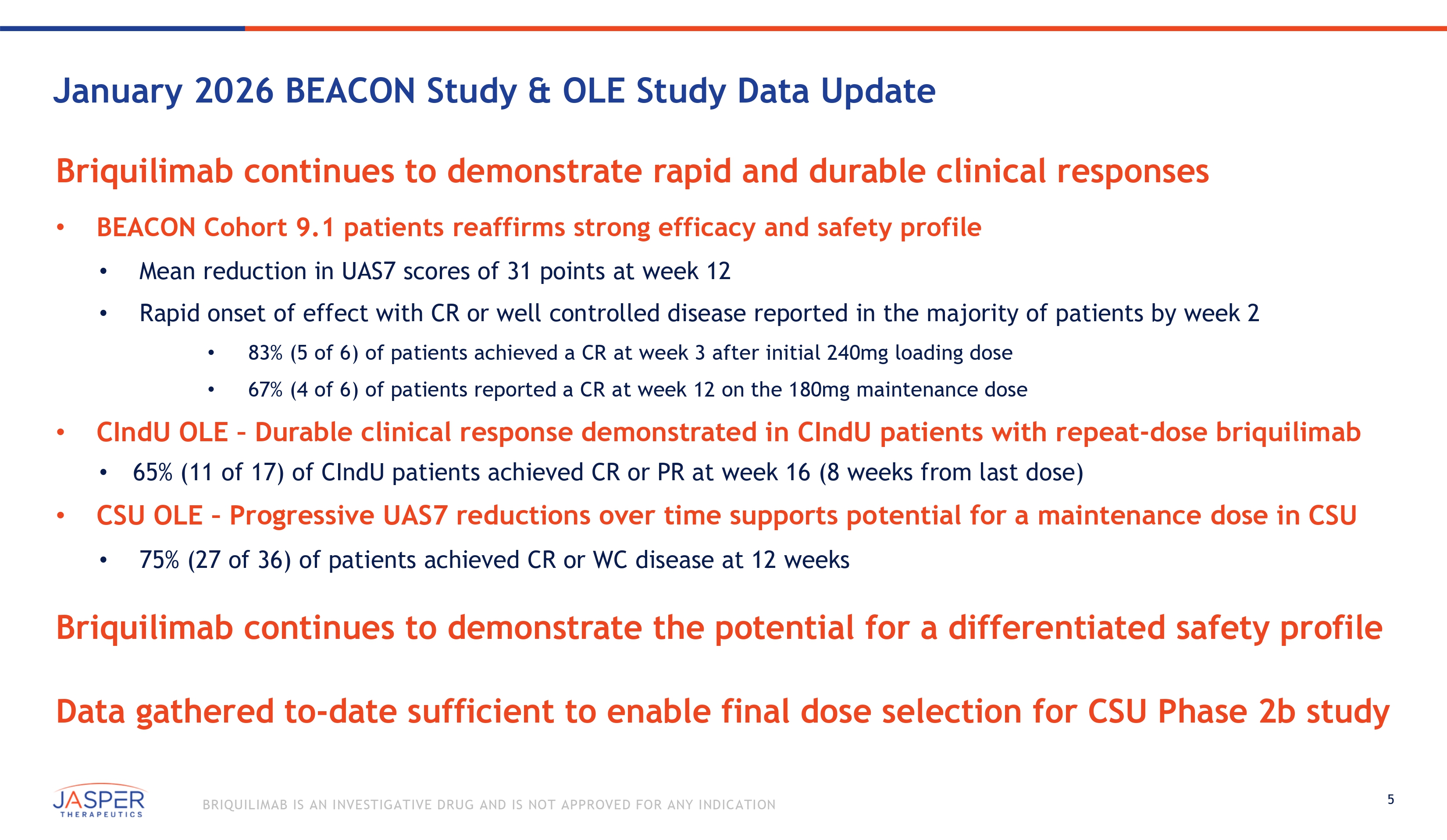3 BRIQUILIMAB IS AN INVESTIGATIVE DRUG AND IS NOT APPROVED FOR ANY INDICATION New BEACON and OLE data support advancing into a Phase 2b CSU study in 2H 2026 Briquilimab’s unique drug properties allow for rapid clinical efficacy while minimizing KIT related AEs • Briquilimab’s MOA (direct ligand/receptor blockade) and high Cmax leads to rapid mast cell depletion with deep UAS7 reduction and disease control in first 2 - 4 weeks • Drug clearance near end of 8 week dosing cycle allows for reduction of KIT related AEs and improved profile for patients Briquilimab continues to demonstrate rapid and durable clinical responses • 10 additional patients enrolled in the BEACON study – Eight (6 briquilimab + 2 placebo) in Cohort 9.1(240mg 180mg Q8W) and 2 in Cohort 8.1(240mg Q8W) • New Cohort 9.1: 83% (5 of 6) of briquilimab patients achieved a CR by week 3, with 67% (4 of 6) CRs at 12 weeks Briquilimab was well tolerated and demonstrates a favorable chronic safety profile • OLE (n=63, 180mg Q8W median duration > 200 days) shows deepening efficacy with low incidence of KIT related AEs Data support commencing a Phase 2b study as part of a CSU registrational program in 2H 2026 • Phase 2b study expected to be a 75 - 100 patient multi - site study evaluating two effective dose regimens vs. placebo Briquilimab continues to demonstrate differentiated efficacy & safety profile