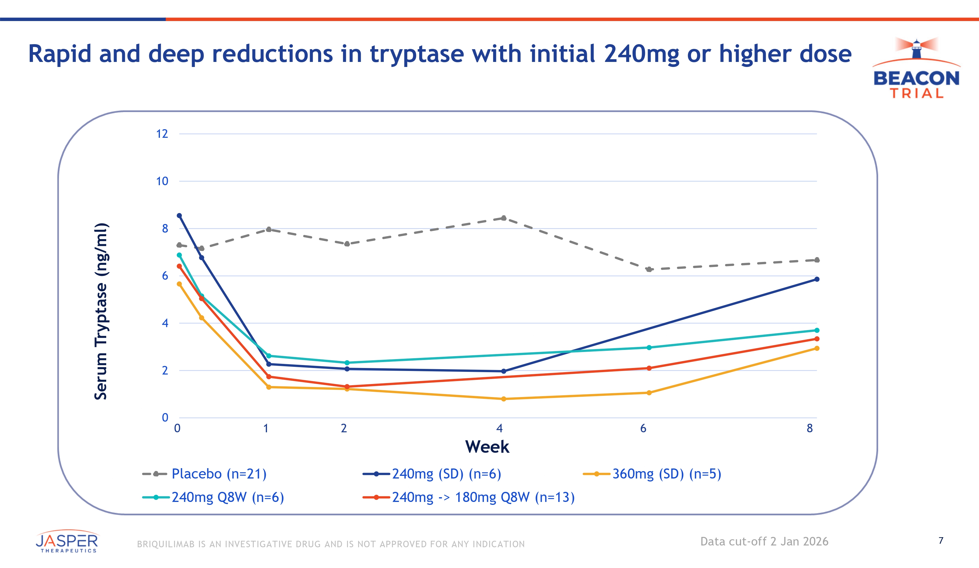 6 BRIQUILIMAB IS AN INVESTIGATIVE DRUG AND IS NOT APPROVED FOR ANY INDICATION • UAS7 ≥ 16 • 18+ years Screening/Eligibility • CSU diagnosis ≥ 6 mos. • H1 - antihistamine - failed Study Operations • US Lead: Tom Casale, MD • EU Lead: Martin Metz, MD • ~30 sites in the US & EU Key Assessments • Disease Scores: UAS7, UCT • Safety: TEAEs, SAEs • PK • Mast Cell Depletion & Recovery: Serum Tryptase, Skin Biopsies Phase 1b/2a BEACON Study in Chronic Spontaneous Urticaria Randomized, Double - Blind, Placebo - Controlled, Multiple Ascending Dose Study Pa t i e n t s (Randomization) Dose Sch e du l e n=3+3 per dose n=8 (3:1) 10mg & 40mg 80mg Open Label (n=6) Double - Blind Placebo - Controlled (n=81) Cohorts included in January 2025/July 2025 data cuts Additional patients enrolled since July 2025 data update Weeks 0, 4, 12, 20 Q8W Q8W Q12W Q8W Q12W Single Dose 120mg 180mg 240mg 240mg → 180mg 360mg Single Dose Q8W Cohor t # C1 & C2 C4a C4b C5b C5a C3 C7 n=10 (3:1) n=9 (3:1) n=6 (2:1) n=6 (2:1) Single Dose n=9 (3:1) n=8(3:1) 240mg C6 n=8 (3:1) n=6 (3:1) n=9 (3:1) n=2(3:1) C9 C9.1 C8 C8.1 Q8W Q8W