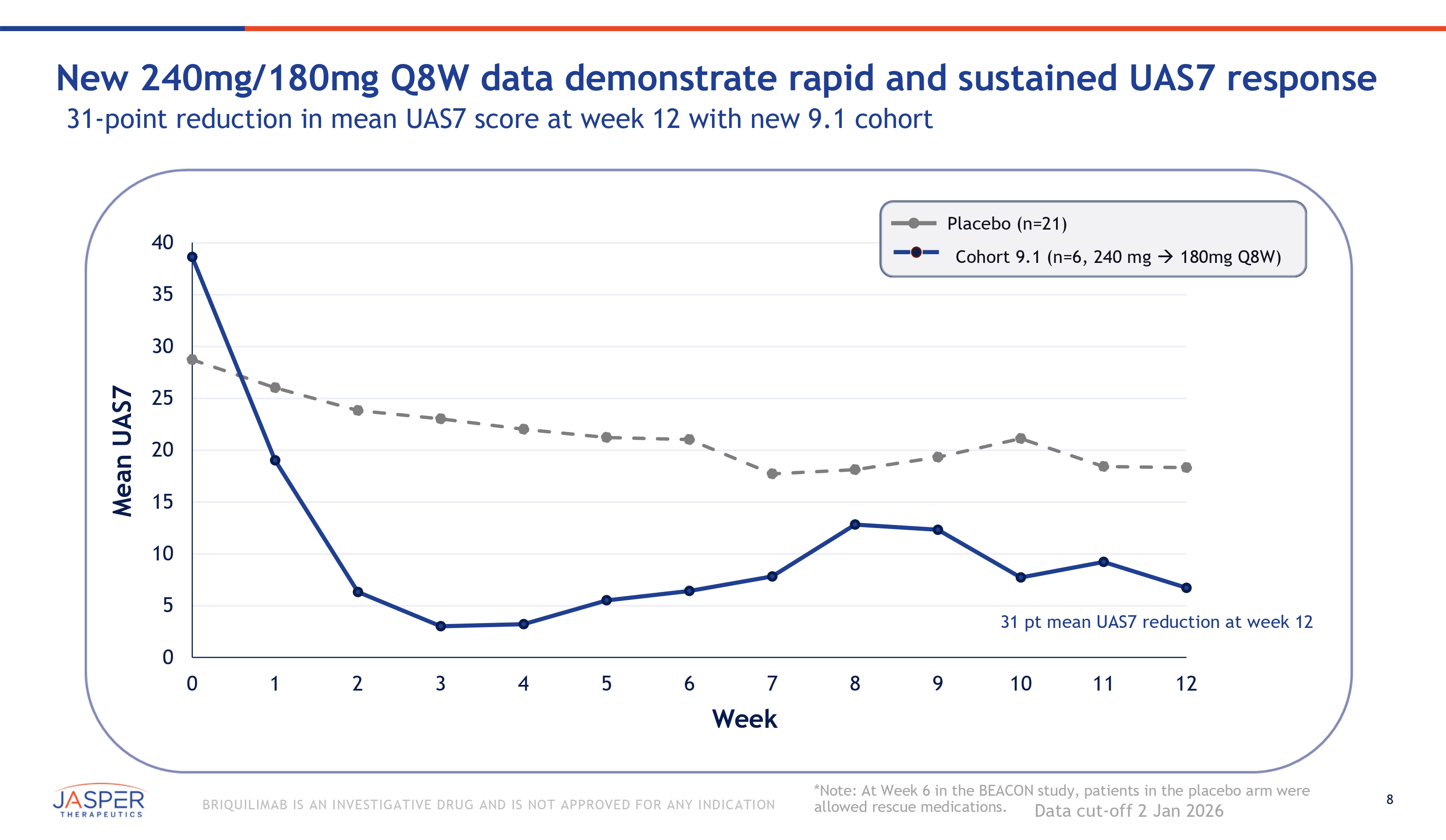 7 BRIQUILIMAB IS AN INVESTIGATIVE DRUG AND IS NOT APPROVED FOR ANY INDICATION Rapid and deep reductions in tryptase with initial 240mg or higher dose Data cut - off 2 Jan 2026 Serum Tryptase (ng/ml) 12 10 8 6 4 2 360mg (SD) (n=5) 0 0 1 Placebo (n=21) 240mg Q8W (n=6) 2 4 Week 240mg (SD) (n=6) 240mg - > 180mg Q8W (n=13) 6 8