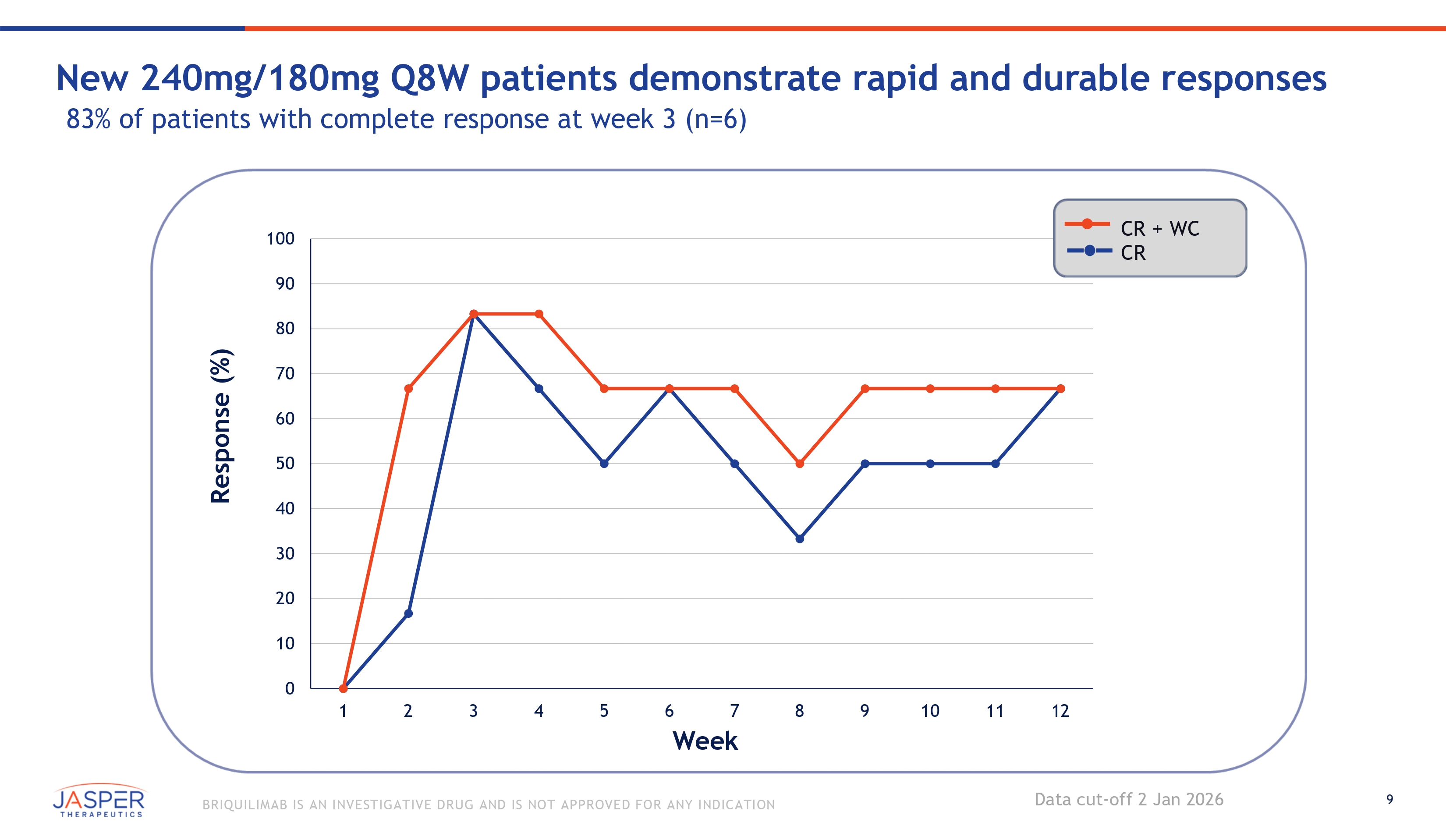 8 BRIQUILIMAB IS AN INVESTIGATIVE DRUG AND IS NOT APPROVED FOR ANY INDICATION New 240mg/180mg Q8W data demonstrate rapid and sustained UAS7 response 31 - point reduction in mean UAS7 score at week 12 with new 9.1 cohort Mean UAS7 0 35 30 25 20 15 10 5 40 0 1 2 3 4 5 6 7 Week 8 9 Placebo (n=21) Cohort 9.1 (n=6, 240 mg 180mg Q8W) 31 pt mean UAS7 reduction at week 12 10 11 12 *Note: At Week 6 in the BEACON study, patients in the placebo arm were allowed rescue medications. Data cut - off 2 Jan 2026