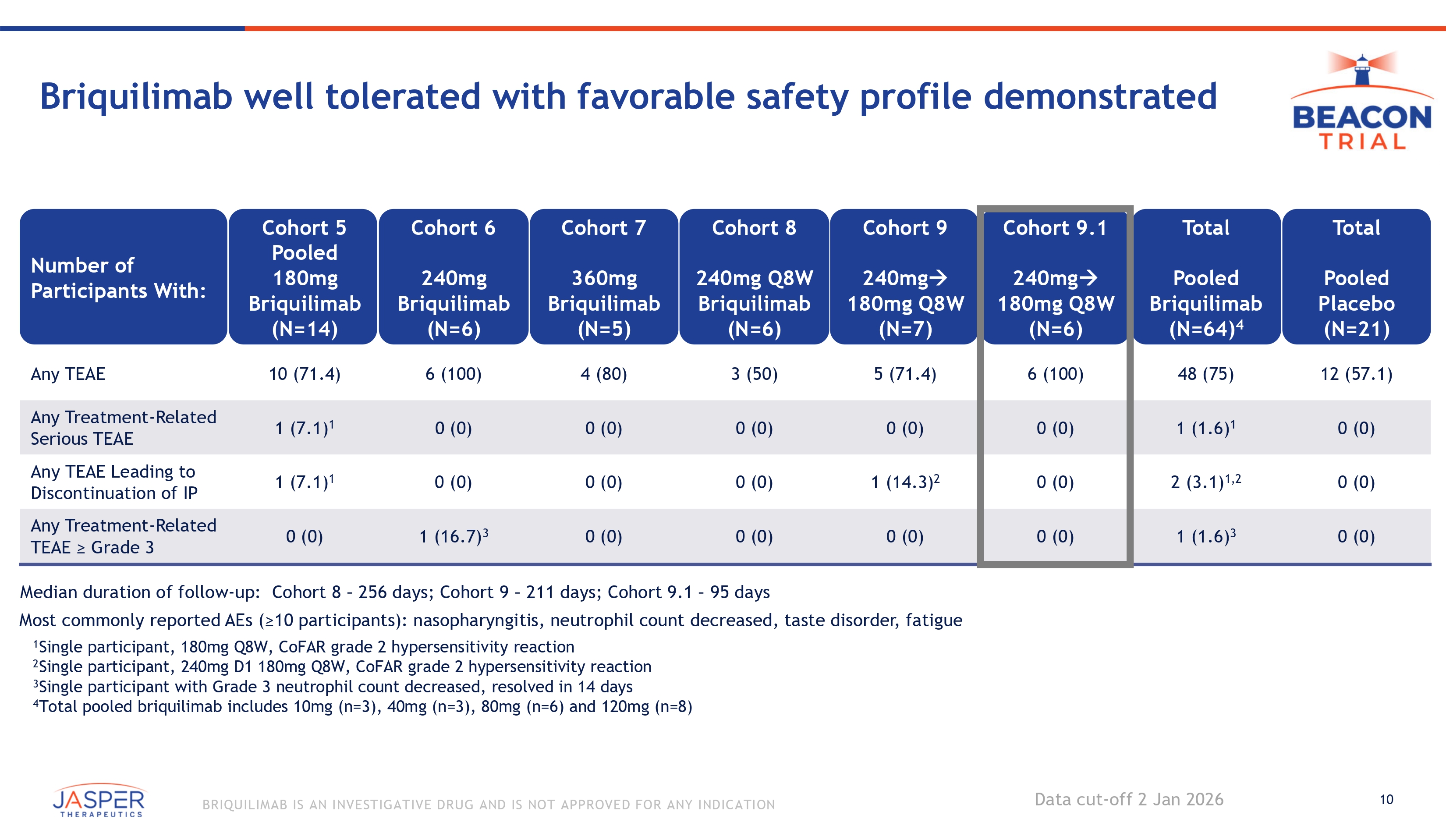 9 BRIQUILIMAB IS AN INVESTIGATIVE DRUG AND IS NOT APPROVED FOR ANY INDICATION Response (%) 90 80 70 60 50 40 30 20 10 0 100 1 2 3 4 5 6 7 Week 8 9 10 11 12 CR + WC CR New 240mg/180mg Q8W patients demonstrate rapid and durable responses 83% of patients with complete response at week 3 (n=6) Data cut - off 2 Jan 2026