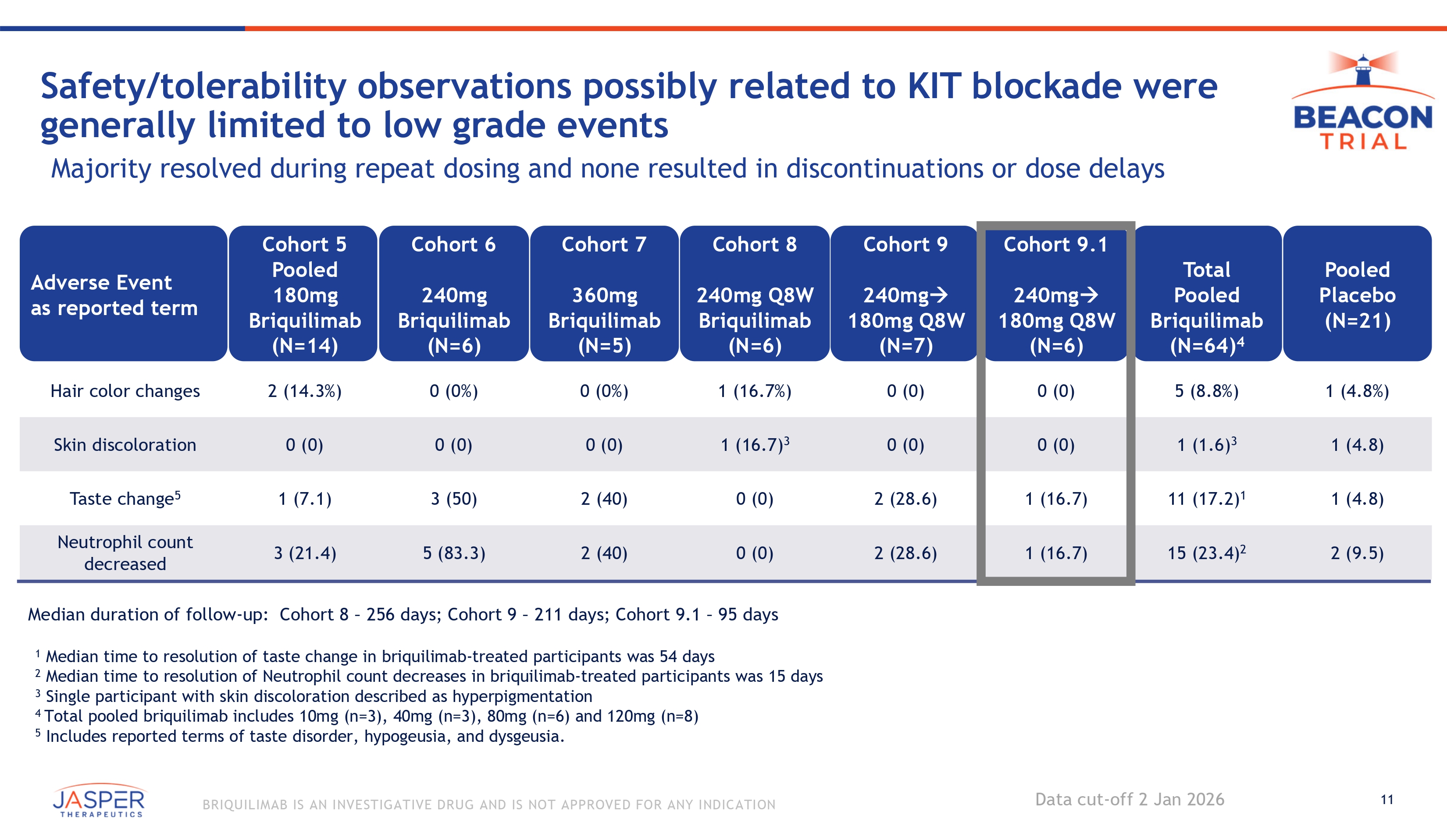10 BRIQUILIMAB IS AN INVESTIGATIVE DRUG AND IS NOT APPROVED FOR ANY INDICATION Briquilimab well tolerated with favorable safety profile demonstrated Total Pooled Placebo (N= 21 ) 12 ( 57 . 1 ) Total Pooled Briquilimab (N=64) 4 48 (75) Cohort 9.1 240mg 180mg Q8W (N=6) 6 (100) Cohort 9 240mg 180mg Q8W (N=7) 5 (71.4) Cohort 8 240mg Q8W Briquilimab (N=6) 3 (50) Cohort 7 360mg Briquilimab (N=5) 4 (80) Cohort 6 240mg Briquilimab (N=6) 6 (100) Cohort 5 Pooled 180mg Briquilimab (N=14) 10 (71.4) Number of Participants With: Any TEAE 0 (0) 1 (1.6) 1 0 (0) 0 (0) 0 (0) 0 (0) 0 (0) 1 (7.1) 1 Any Treatment - Related Serious TEAE 0 (0) 2 (3.1) 1,2 0 (0) 1 (14.3) 2 0 (0) 0 (0) 0 (0) 1 (7.1) 1 Any TEAE Leading to Discontinuation of IP 0 (0) 1 (1.6) 3 0 (0) 0 (0) 0 (0) 0 (0) 1 (16.7) 3 0 (0) Any Treatment - Related TEAE ≥ Grade 3 Median duration of follow - up: Cohort 8 – 256 days; Cohort 9 – 211 days; Cohort 9.1 – 95 days Most commonly reported AEs (≥10 participants): nasopharyngitis, neutrophil count decreased, taste disorder, fatigue 1 Single participant, 180mg Q8W, CoFAR grade 2 hypersensitivity reaction 2 Single participant, 240mg D1 180mg Q8W, CoFAR grade 2 hypersensitivity reaction 3 Single participant with Grade 3 neutrophil count decreased, resolved in 14 days 4 Total pooled briquilimab includes 10mg (n=3), 40mg (n=3), 80mg (n=6) and 120mg (n=8) Data cut - off 2 Jan 2026