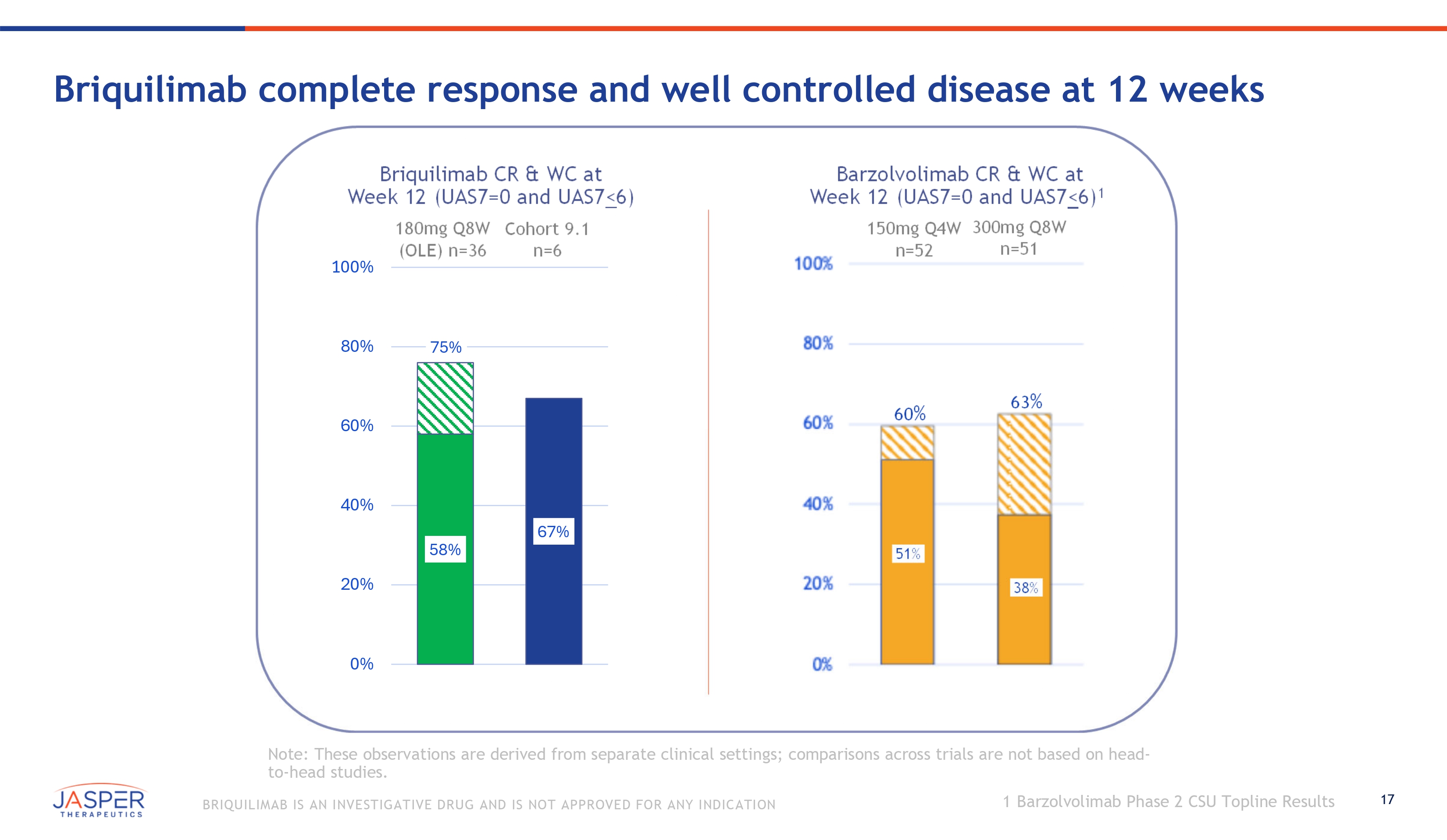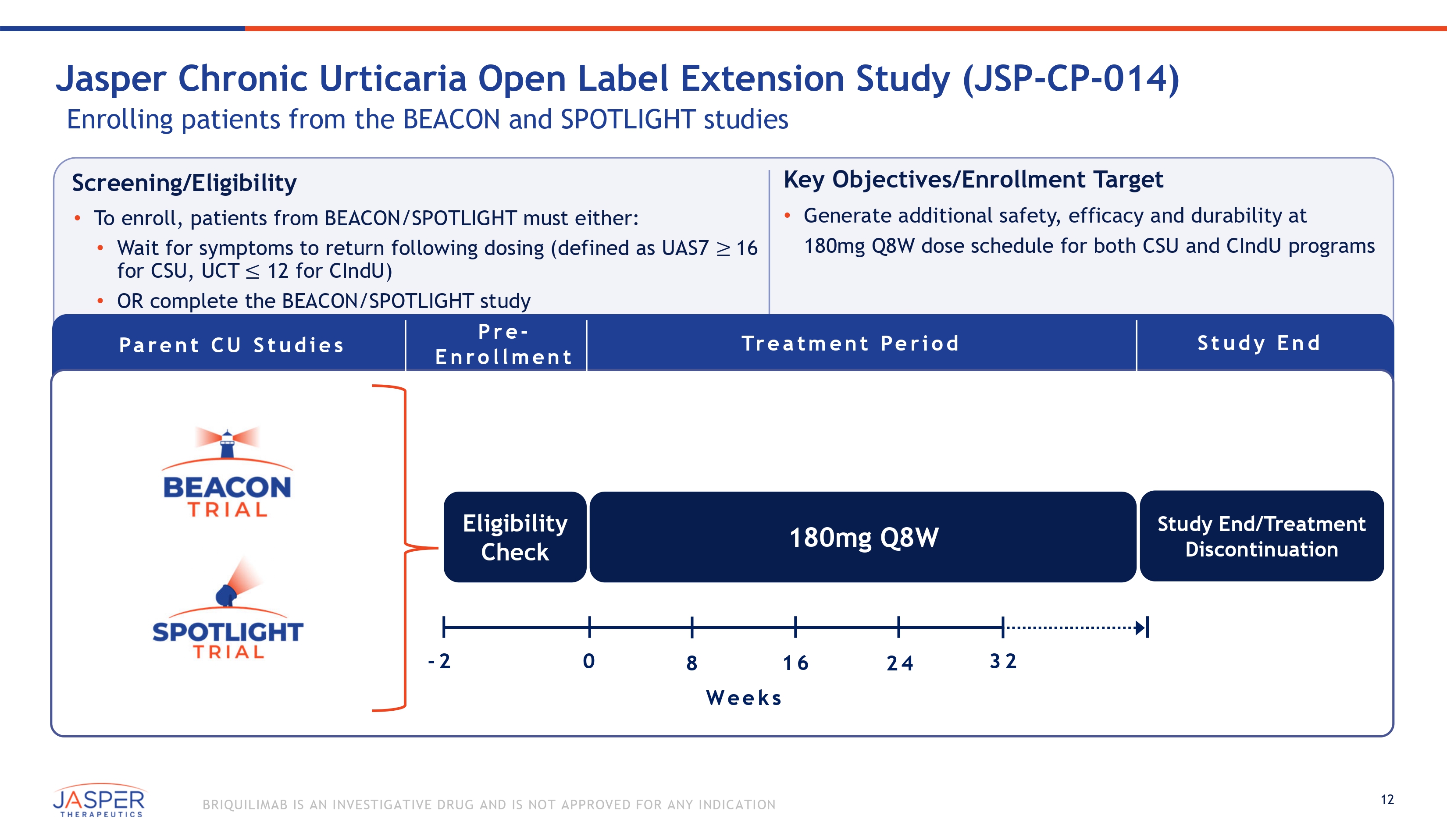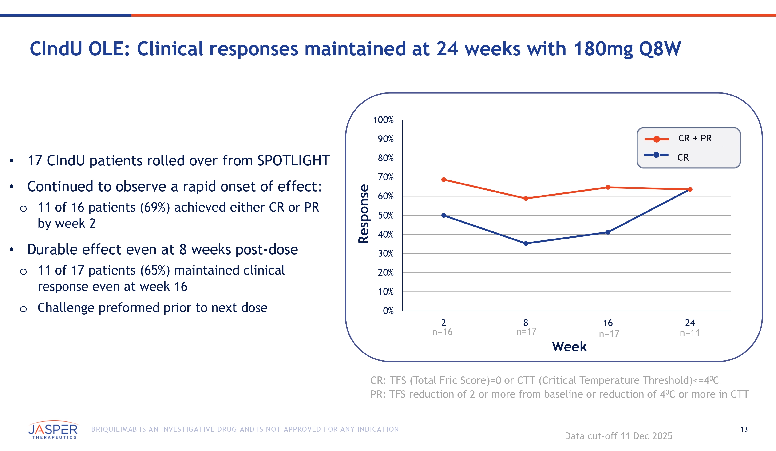 12 BRIQUILIMAB IS AN INVESTIGATIVE DRUG AND IS NOT APPROVED FOR ANY INDICATION Screening/Eligibility • To enroll, patients from BEACON/SPOTLIGHT must either: • Wait for symptoms to return following dosing (defined as UAS7 ≥ 16 for CSU, UCT ≤ 12 for CIndU) • OR complete the BEACON/SPOTLIGHT study Key Objectives/Enrollment Target • Generate additional safety, efficacy and durability at 180mg Q8W dose schedule for both CSU and CIndU programs Jasper Chronic Urticaria Open Label Extension Study (JSP - CP - 014) Enrolling patients from the BEACON and SPOTLIGHT studies Pa r e n t C U S t u d i e s Tr e a t m e n t Pe r i o d Pre - E n rollment 180mg Q8W Eligibility Check We e k s - 2 0 8 16 24 32 Study End/Treatment Discontinuation Stu d y End