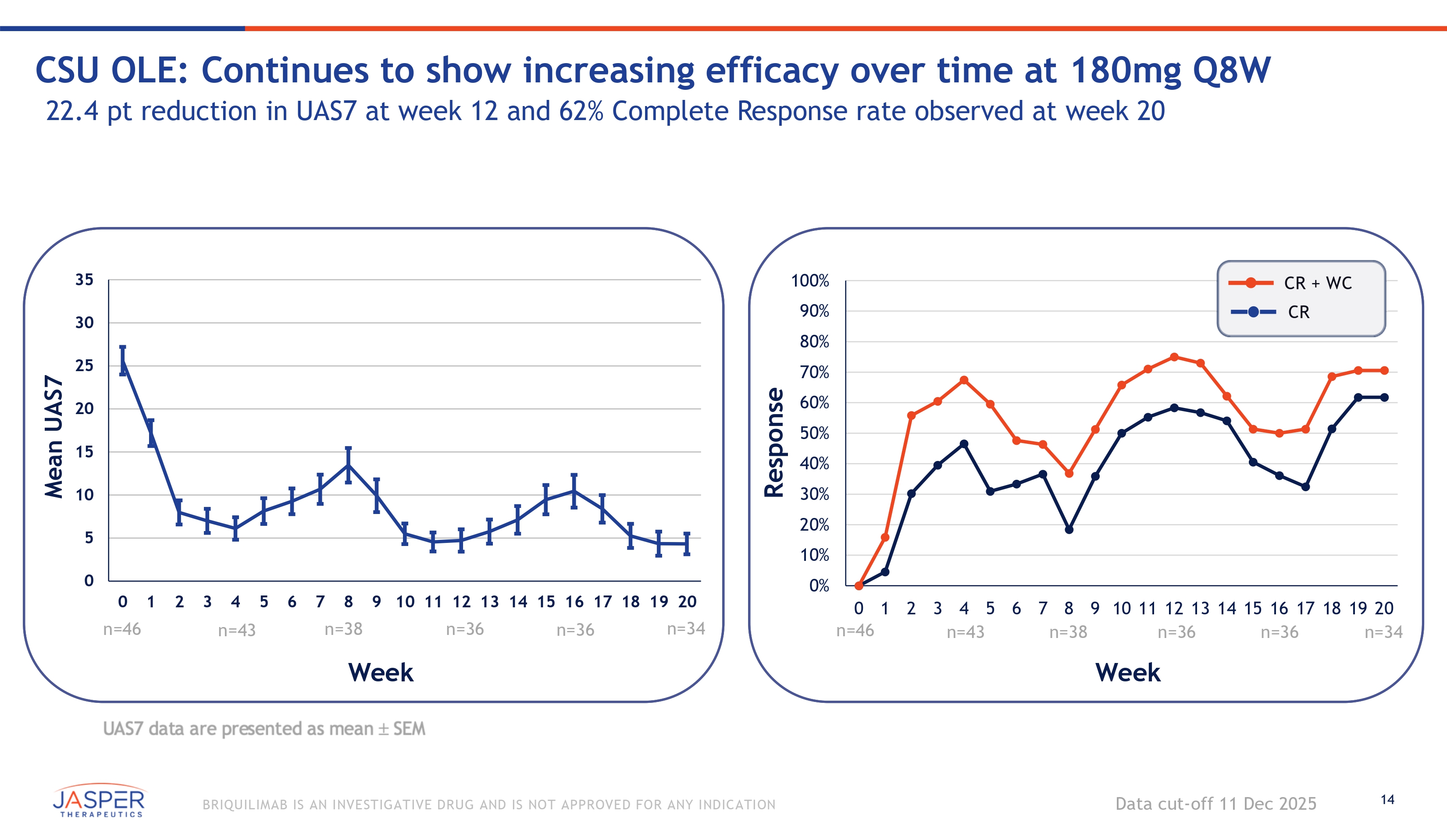 13 BRIQUILIMAB IS AN INVESTIGATIVE DRUG AND IS NOT APPROVED FOR ANY INDICATION CIndU OLE: Clinical responses maintained at 24 weeks with 180mg Q8W • 17 CIndU patients rolled over from SPOTLIGHT • Continued to observe a rapid onset of effect: o 11 of 16 patients (69%) achieved either CR or PR by week 2 • Durable effect even at 8 weeks post - dose o 11 of 17 patients (65%) maintained clinical response even at week 16 o Challenge preformed prior to next dose Response Week CR: TFS (Total Fric Score)=0 or CTT (Critical Temperature Threshold)<=4 0 C PR: TFS reduction of 2 or more from baseline or reduction of 4 0 C or more in CTT Data cut - off 11 Dec 2025 100% 90% 80% 70% 60% 50% 40% 30% 20% 10% 0% 2 n=16 8 n=17 16 n=17 24 n=11 CR + PR CR