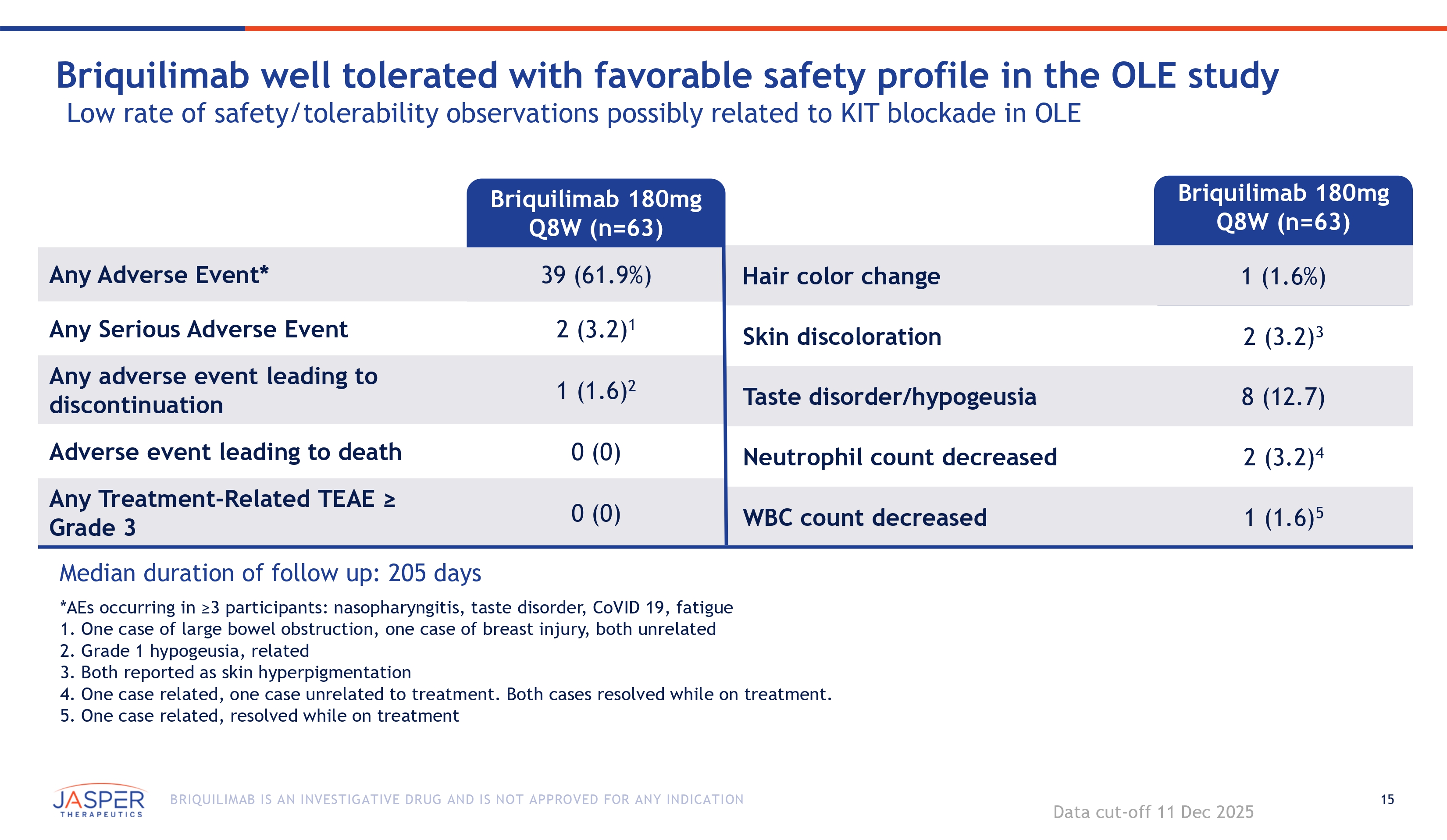 14 BRIQUILIMAB IS AN INVESTIGATIVE DRUG AND IS NOT APPROVED FOR ANY INDICATION 0 5 10 15 20 25 30 35 0 1 2 3 4 5 6 7 8 9 10 11 12 13 14 15 16 17 18 19 20 n=46 CSU OLE: Continues to show increasing efficacy over time at 180mg Q8W 22.4 pt reduction in UAS7 at week 12 and 62% Complete Response rate observed at week 20 Data cut - off 11 Dec 2025 Mean UAS7 n=43 n=38 n=36 n=36 Week 100% 90% 80% 70% 60% 50% 40% 30% 20% 10% 0% Response CR + WC CR n=38 0 1 2 3 4 5 6 7 8 9 10 11 12 13 14 15 16 17 18 19 20 n=46 n=43 n=36 n=36 n=34 Week n=34