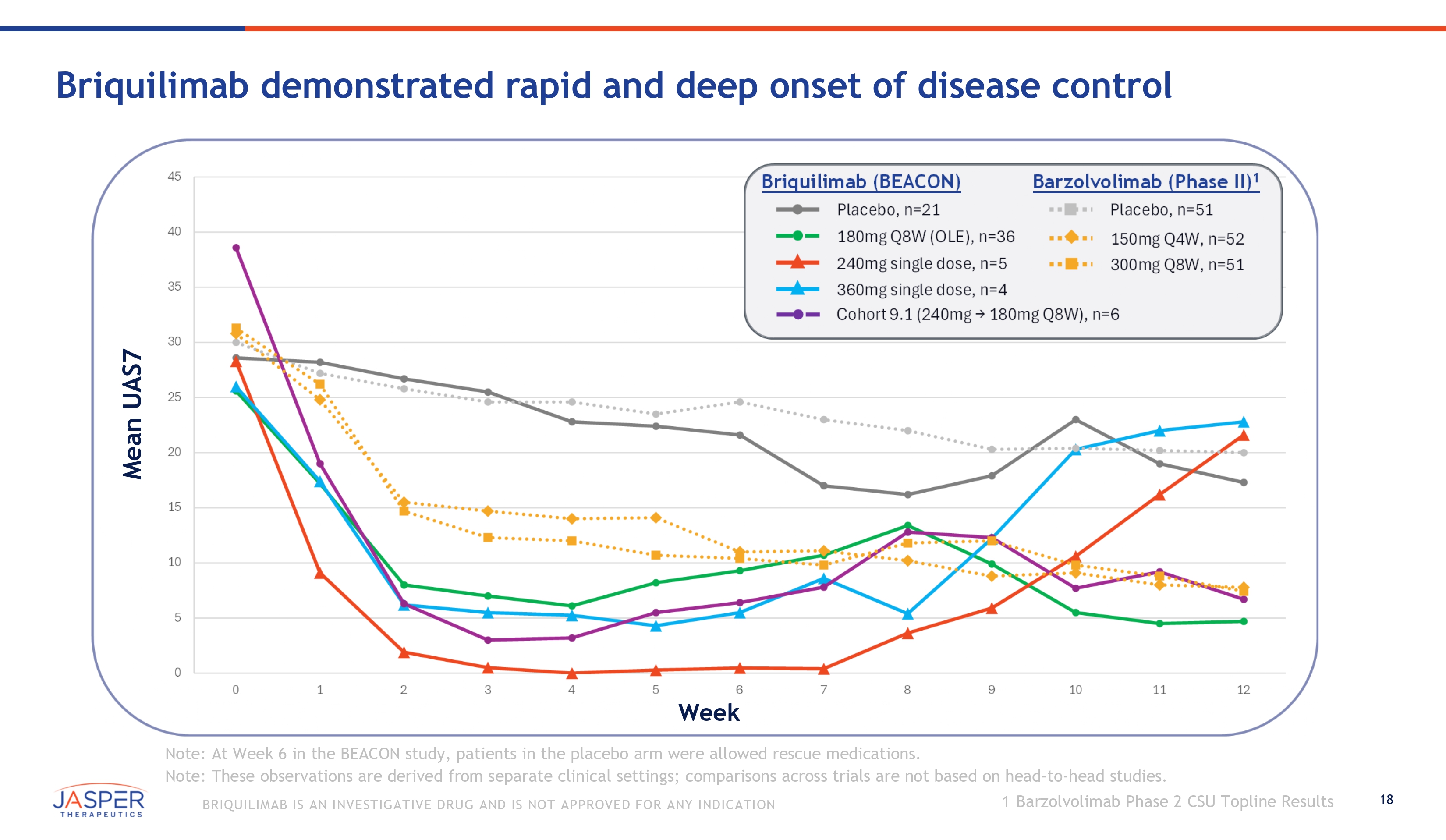 17 BRIQUILIMAB IS AN INVESTIGATIVE DRUG AND IS NOT APPROVED FOR ANY INDICATION Briquilimab complete response and well controlled disease at 12 weeks Note: These observations are derived from separate clinical settings; comparisons across trials are not based on head - to - head studies. 51% 38% Briquilimab CR & WC at Barzolvolimab CR & WC at Week 12 (UAS7=0 and UAS7<6) Week 12 (UAS7=0 and UAS7<6) 1 180mg Q8W Cohort 9.1 150mg Q4W 300mg Q8W (OLE) n=36 n=6 n=52 n=51 60 % 63 % 58% 67% 75% 0% 20% 40% 60% 80% 100% 1 Barzolvolimab Phase 2 CSU Topline Results
