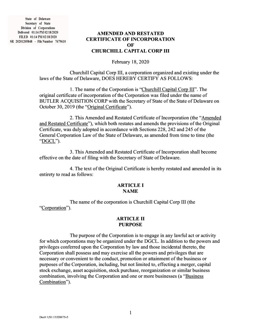 4.3 Warrant Agreement, dated February 13, 2020, between Continental Stock Transfer & Trust Company and Churchill Capital Corp III 8-K 001-39228 4.1 February 19, 2020