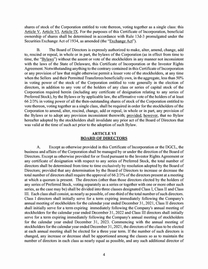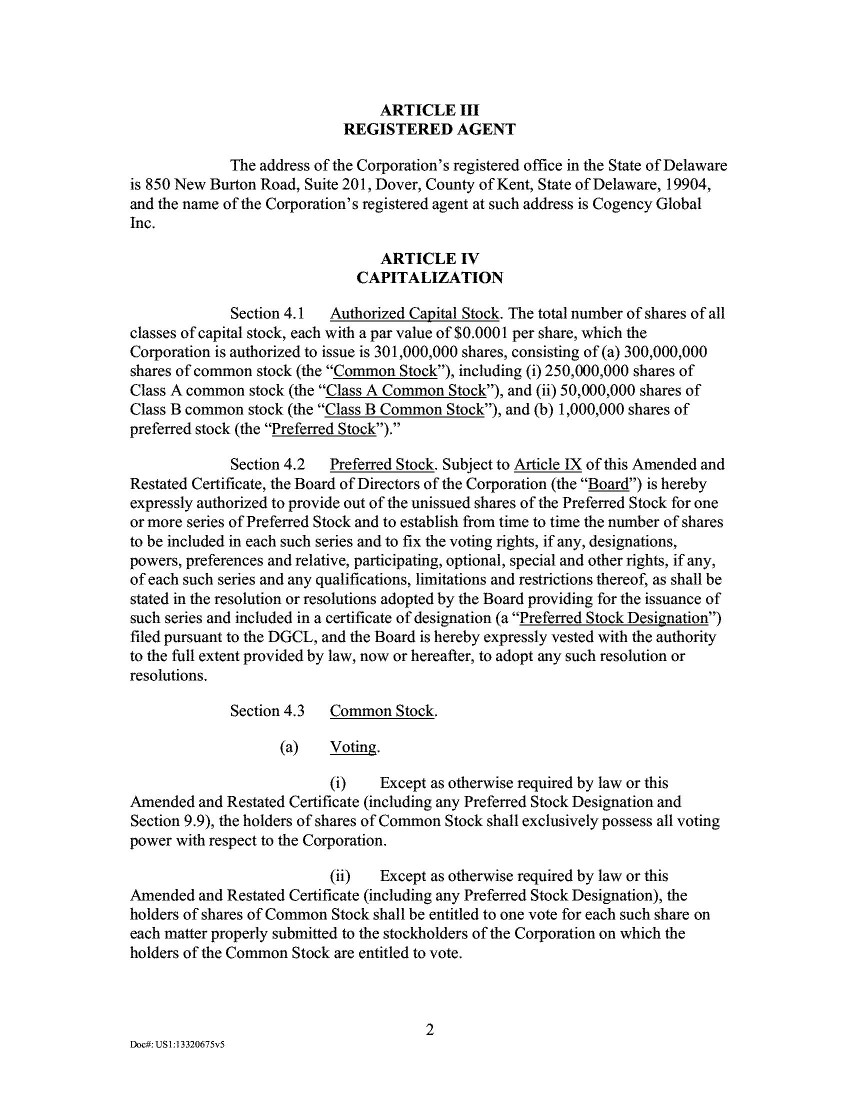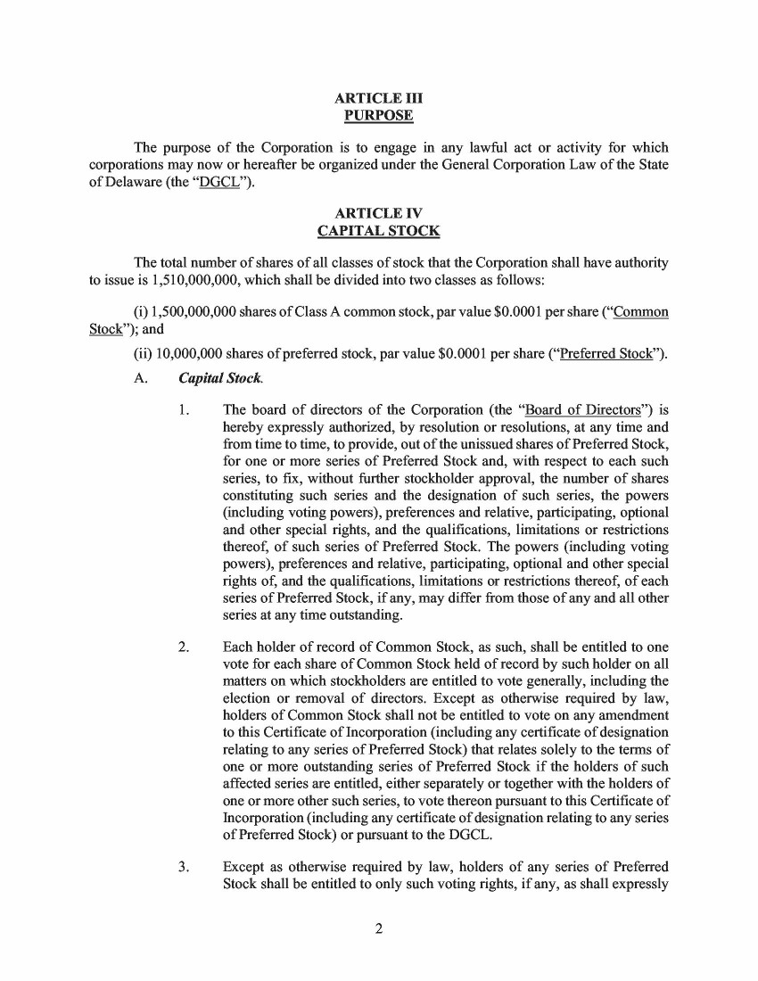 The total number of shares of all classes of capital stock, each with a par value of $0.0001 per share, which the Corporation is authorized to issue is 301,000,000 shares, consisting of (a) 300,000,000 shares of common stock (the “Common Stock”), including (i) 250,000,000 shares of Class A Common Stock (the “Class A Common Stock”), and (ii) 50,000,000 shares of Class B common stock (the “Class B Common Stock”), and (b) 1,000,000 shares of preferred stock (the “Preferred Stock”).