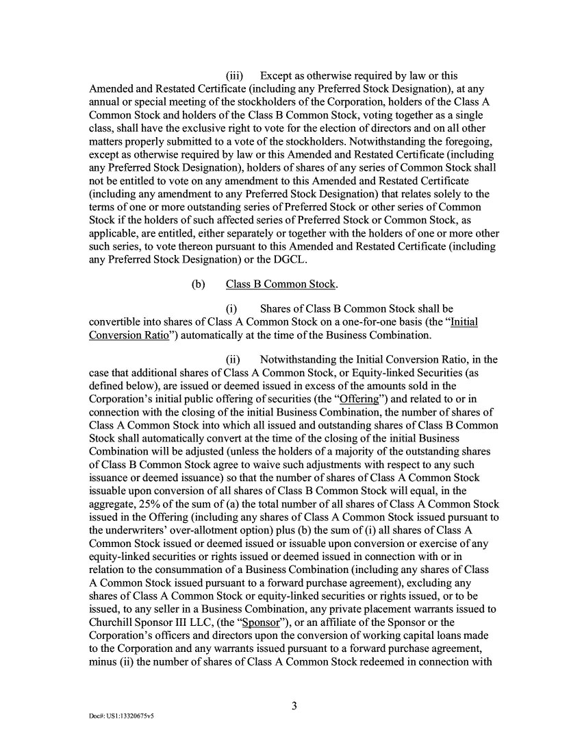 3C.           A proposal to increase Churchill’s total number of authorized shares of all classes of capital stock from 301,000,000 shares to 1,510,000,000 shares, which would consist of increasing the authorized number of shares of (i) Class A common stock from 250,000,000 shares to 1,500,000,000 shares and (ii) preferred stock from 1,000,000 shares to 10,000,000 shares. The following is a tabulation of the votes with respect to this proposal, which was approved by Churchill’s stockholders: