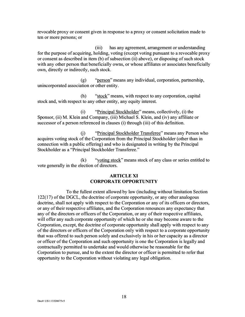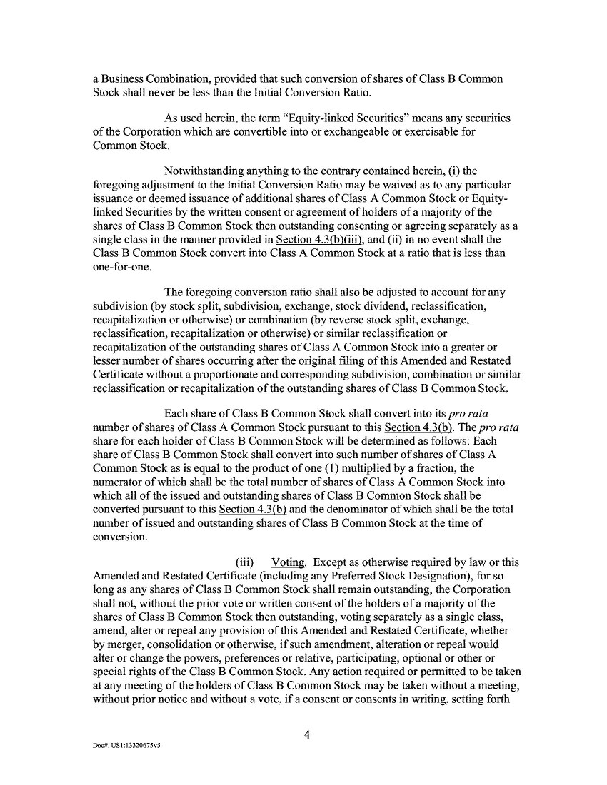 4.             After entering into the Merger Agreement, the Company scheduled a special meeting of stockholders of the SPAC (the “Special Meeting”). Pursuant to its September 18, 2020, proxy statement (the “2020 Proxy”), at the Special Meeting, the stockholders would be asked to consider and vote upon, among other things, a proposal to approve the Merger Agreement and the transactions contemplated by the Merger Agreement, as well as a proposal to approve and adopt the New Certificate of Incorporation. Ex. A at 82. The New Certificate of Incorporation that the Company’s stockholders were asked to consider and vote on would increase the total number of authorized shares of all classes of the Company’s capital stock. Specifically, the approval and adoption of the New Certificate of Incorporation would increase the authorized number of shares of Class A Common Stock from 250,000,000 to 1,500,000,000 shares and the authorized number of shares of preferred stock from 1,000,000 shares to 10,000,000 shares. Ex. A at 137.