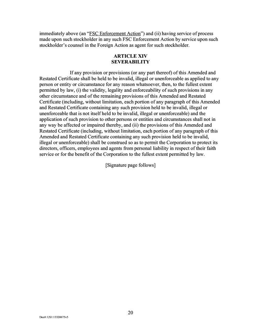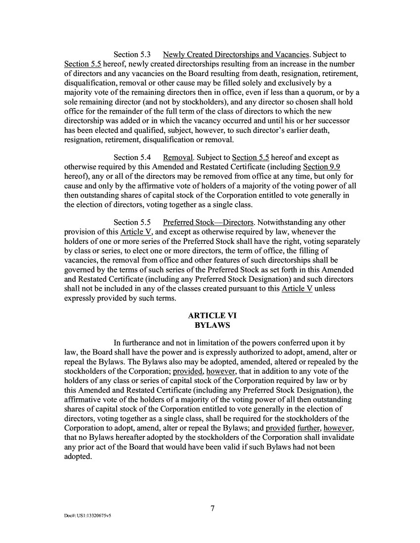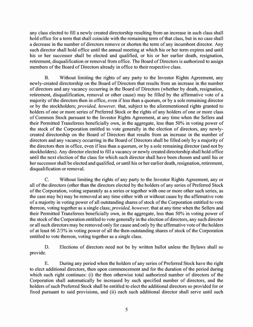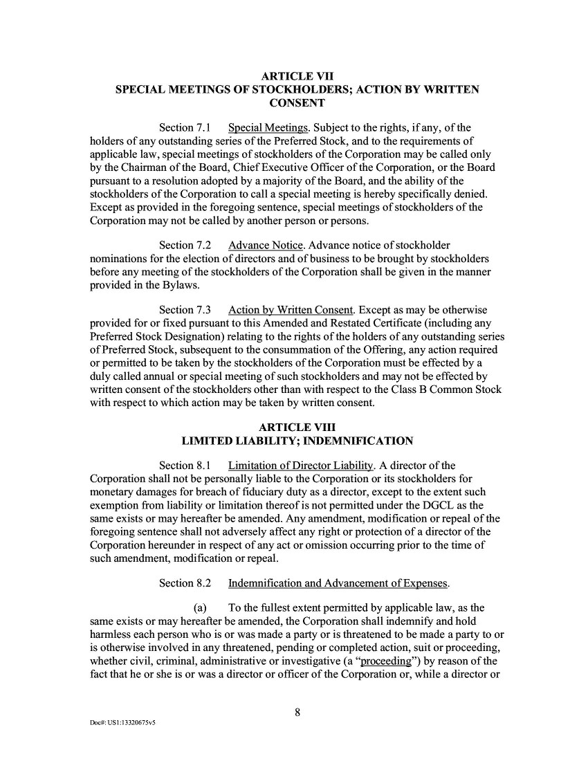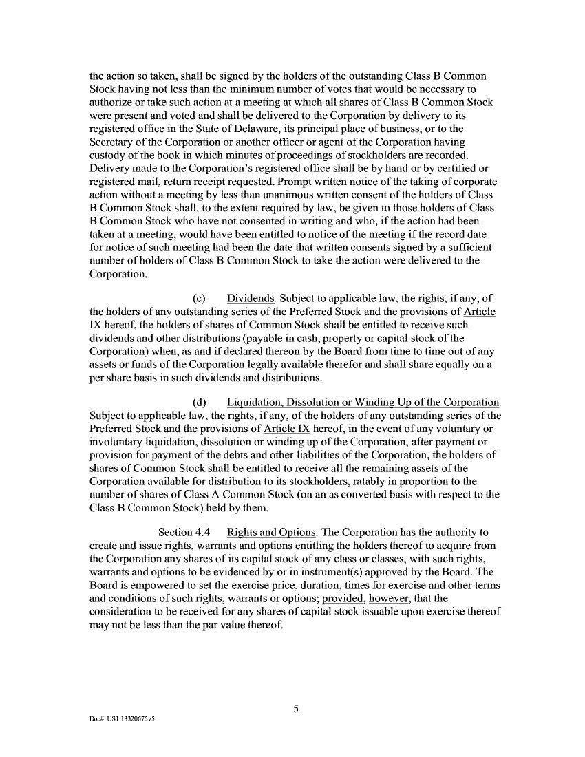 18.       The New Certificate of Incorporation, annexed to the 2020 Proxy, and attached hereto as Exhibit D, also explained that “[a]s part of the transactions contemplated by the Merger Agreement, all 27,500,000 shares of the Class B Common Stock of the [Company would be] converted on a 1-for-1 basis into 27,500,000 shares of Class A Common Stock of the [Company] such that, at the effectiveness of [the New Certificate of Incorporation], only Class A Common Stock remains outstanding.” Id. at 421.