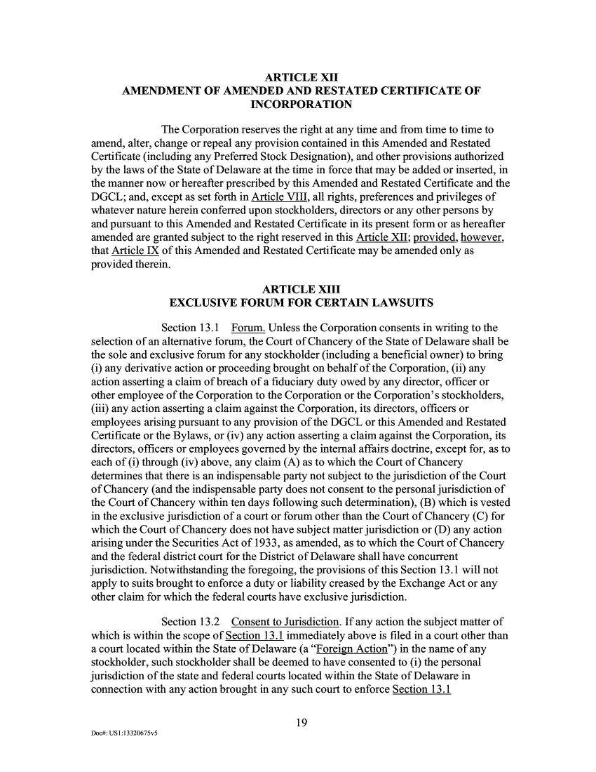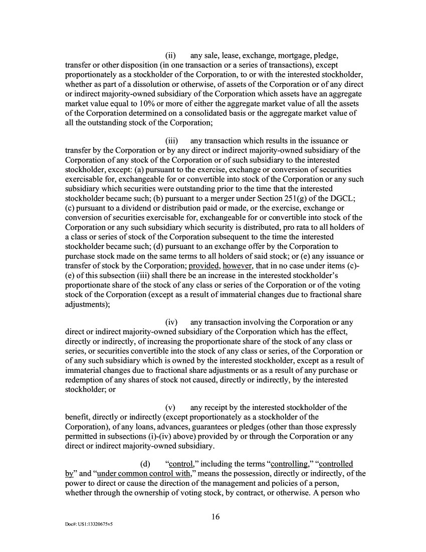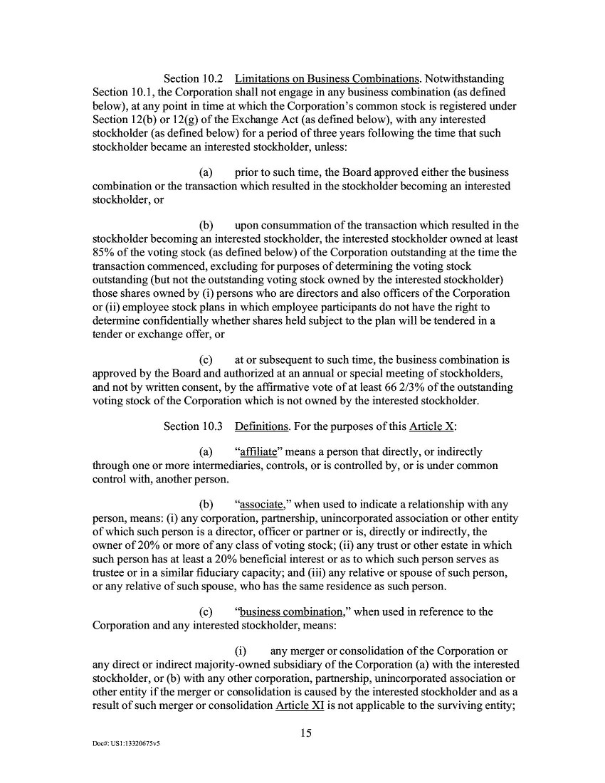 5.             The 2020 Proxy provided that the proposal to approve and adopt the New Certificate of Incorporation would “require[] the affirmative vote of holders of a majority of [the Company’s] outstanding shares of common stock entitled to vote thereon at the [S]pecial [M]eeting.” Id. at 94. The Company held the Special Meeting on October 7, 2020, where “a majority of the shares of [the Company’s] common stock entitled to vote at the Special Meeting” were represented by proxy. Ex. B at 28. At the Special Meeting, the proposal to approve and adopt the New Certificate of Incorporation received approximately 93% approval from the holders of the Company’s outstanding common stock. Id.