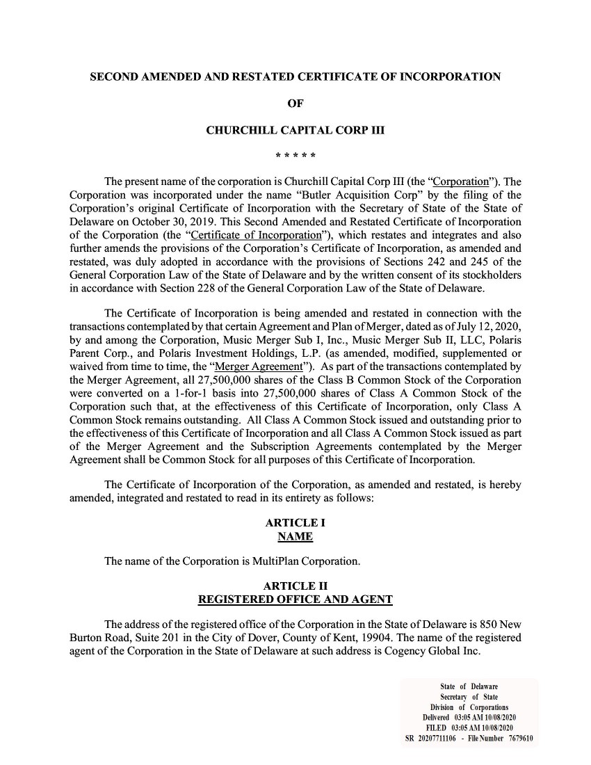 3.1 Second Amended and Restated Certificate of Incorporation of MultiPlan Corporation
