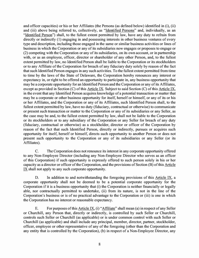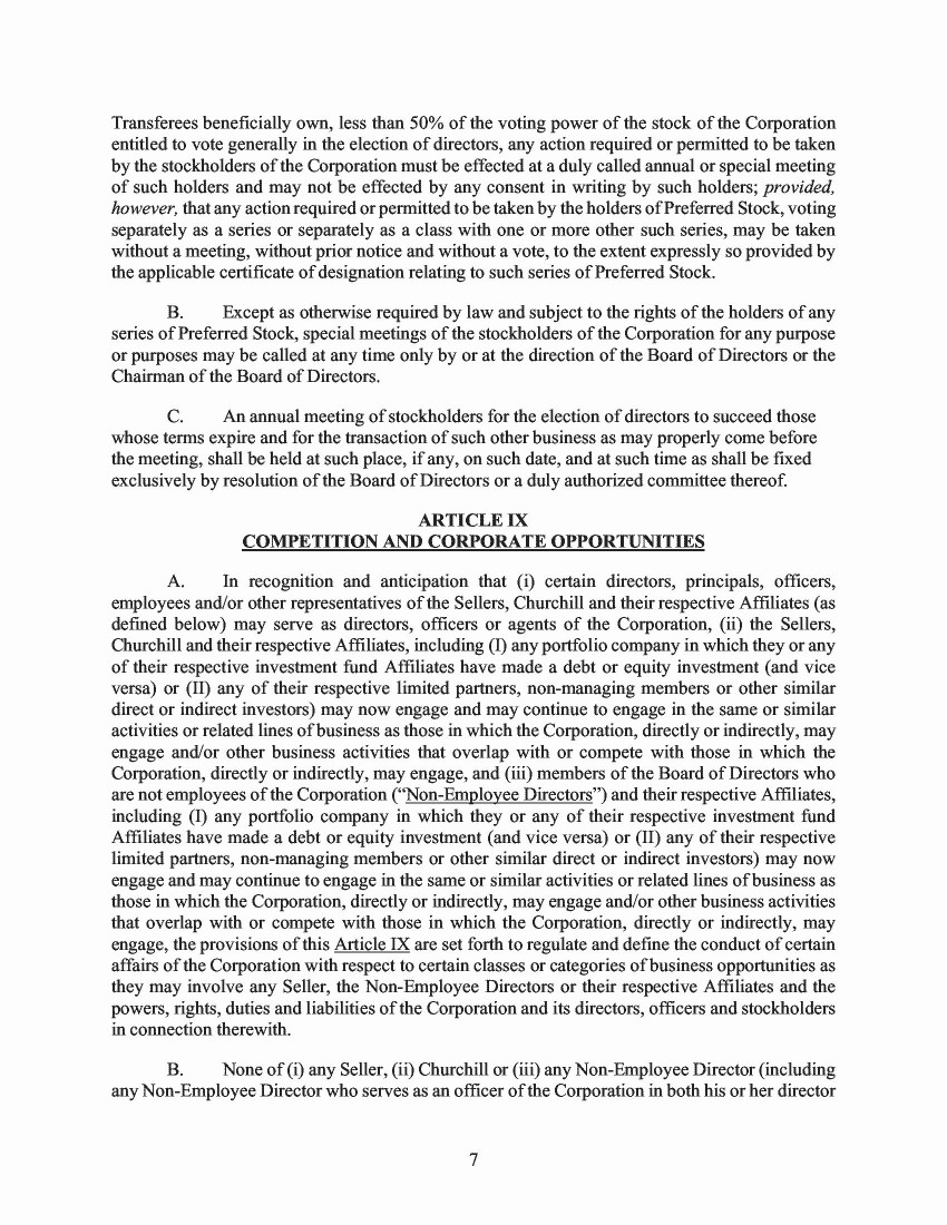 3D.           A proposal to approve provisions in the second amended and restated certificate of incorporation that provide that certain transactions are not “corporate opportunities” and that each of the Sellers, Churchill and their respective affiliates and the investment funds affiliated with the Sellers and Churchill and their respective successors and affiliates and all of their respective partners, principals, directors, officers, members, managers, equity holders and/or employees, including any of the foregoing who serve as officers or directors of Churchill are not subject to the doctrine of corporate opportunity. The following is a tabulation of the votes with respect to this proposal, which was approved by Churchill’s stockholders: