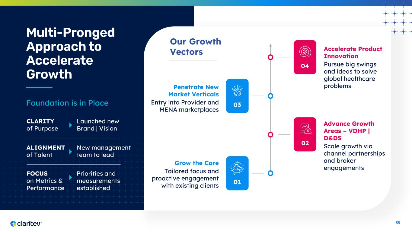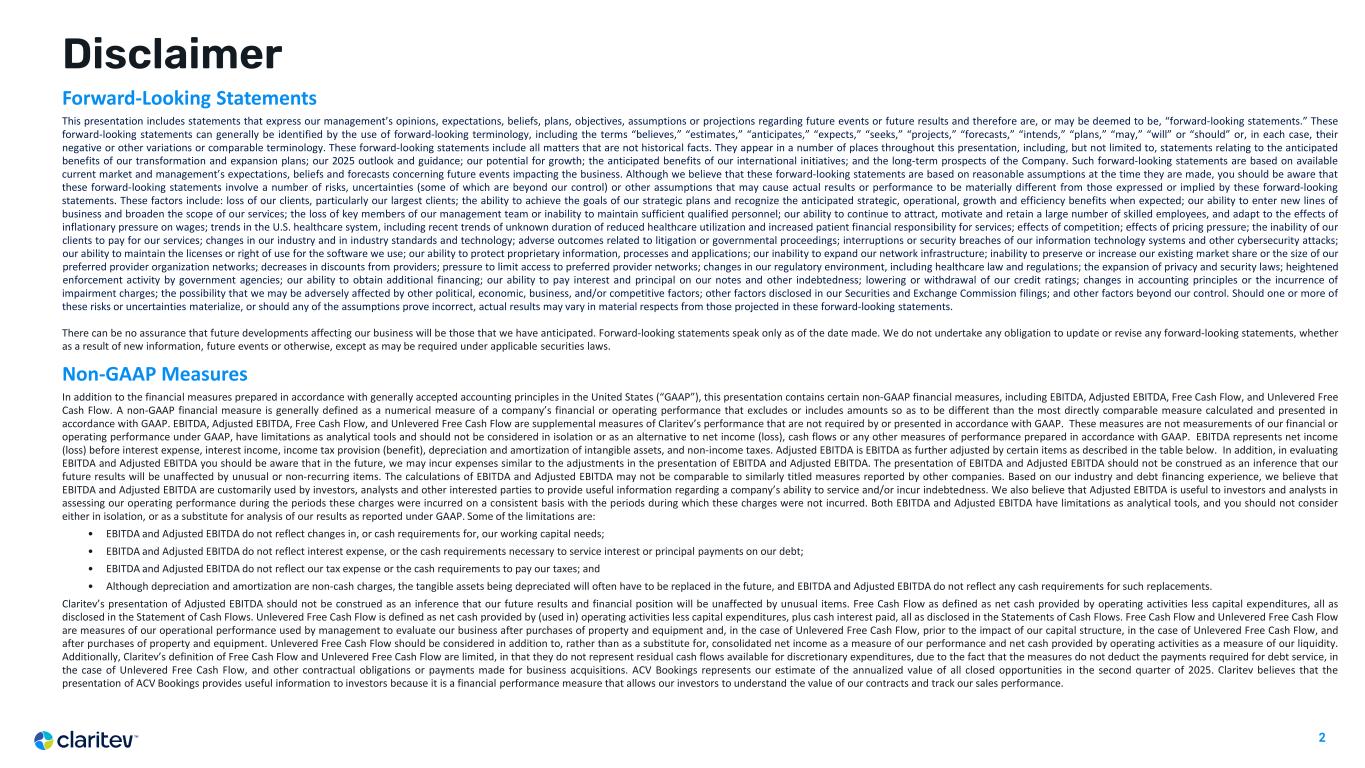 2 Disclaimer Forward-Looking Statements This presentation includes statements that express our management’s opinions, expectations, beliefs, plans, objectives, assumptions or projections regarding future events or future results and therefore are, or may be deemed to be, “forward-looking statements.” These forward-looking statements can generally be identified by the use of forward-looking terminology, including the terms “believes,” “estimates,” “anticipates,” “expects,” “seeks,” “projects,” “forecasts,” “intends,” “plans,” “may,” “will” or “should” or, in each case, their negative or other variations or comparable terminology. These forward-looking statements include all matters that are not historical facts. They appear in a number of places throughout this presentation, including, but not limited to, statements relating to the anticipated benefits of our transformation and expansion plans; our 2025 outlook and guidance; our potential for growth; the anticipated benefits of our international initiatives; and the long-term prospects of the Company. Such forward-looking statements are based on available current market and management’s expectations, beliefs and forecasts concerning future events impacting the business. Although we believe that these forward-looking statements are based on reasonable assumptions at the time they are made, you should be aware that these forward-looking statements involve a number of risks, uncertainties (some of which are beyond our control) or other assumptions that may cause actual results or performance to be materially different from those expressed or implied by these forward-looking statements. These factors include: loss of our clients, particularly our largest clients; the ability to achieve the goals of our strategic plans and recognize the anticipated strategic, operational, growth and efficiency benefits when expected; our ability to enter new lines of business and broaden the scope of our services; the loss of key members of our management team or inability to maintain sufficient qualified personnel; our ability to continue to attract, motivate and retain a large number of skilled employees, and adapt to the effects of inflationary pressure on wages; trends in the U.S. healthcare system, including recent trends of unknown duration of reduced healthcare utilization and increased patient financial responsibility for services; effects of competition; effects of pricing pressure; the inability of our clients to pay for our services; changes in our industry and in industry standards and technology; adverse outcomes related to litigation or governmental proceedings; interruptions or security breaches of our information technology systems and other cybersecurity attacks; our ability to maintain the licenses or right of use for the software we use; our ability to protect proprietary information, processes and applications; our inability to expand our network infrastructure; inability to preserve or increase our existing market share or the size of our preferred provider organization networks; decreases in discounts from providers; pressure to limit access to preferred provider networks; changes in our regulatory environment, including healthcare law and regulations; the expansion of privacy and security laws; heightened enforcement activity by government agencies; our ability to obtain additional financing; our ability to pay interest and principal on our notes and other indebtedness; lowering or withdrawal of our credit ratings; changes in accounting principles or the incurrence of impairment charges; the possibility that we may be adversely affected by other political, economic, business, and/or competitive factors; other factors disclosed in our Securities and Exchange Commission filings; and other factors beyond our control. Should one or more of these risks or uncertainties materialize, or should any of the assumptions prove incorrect, actual results may vary in material respects from those projected in these forward-looking statements. There can be no assurance that future developments affecting our business will be those that we have anticipated. Forward-looking statements speak only as of the date made. We do not undertake any obligation to update or revise any forward-looking statements, whether as a result of new information, future events or otherwise, except as may be required under applicable securities laws. Non-GAAP Measures In addition to the financial measures prepared in accordance with generally accepted accounting principles in the United States (“GAAP”), this presentation contains certain non-GAAP financial measures, including EBITDA, Adjusted EBITDA, Free Cash Flow, and Unlevered Free Cash Flow. A non-GAAP financial measure is generally defined as a numerical measure of a company’s financial or operating performance that excludes or includes amounts so as to be different than the most directly comparable measure calculated and presented in accordance with GAAP. EBITDA, Adjusted EBITDA, Free Cash Flow, and Unlevered Free Cash Flow are supplemental measures of Claritev’s performance that are not required by or presented in accordance with GAAP. These measures are not measurements of our financial or operating performance under GAAP, have limitations as analytical tools and should not be considered in isolation or as an alternative to net income (loss), cash flows or any other measures of performance prepared in accordance with GAAP. EBITDA represents net income (loss) before interest expense, interest income, income tax provision (benefit), depreciation and amortization of intangible assets, and non-income taxes. Adjusted EBITDA is EBITDA as further adjusted by certain items as described in the table below. In addition, in evaluating EBITDA and Adjusted EBITDA you should be aware that in the future, we may incur expenses similar to the adjustments in the presentation of
