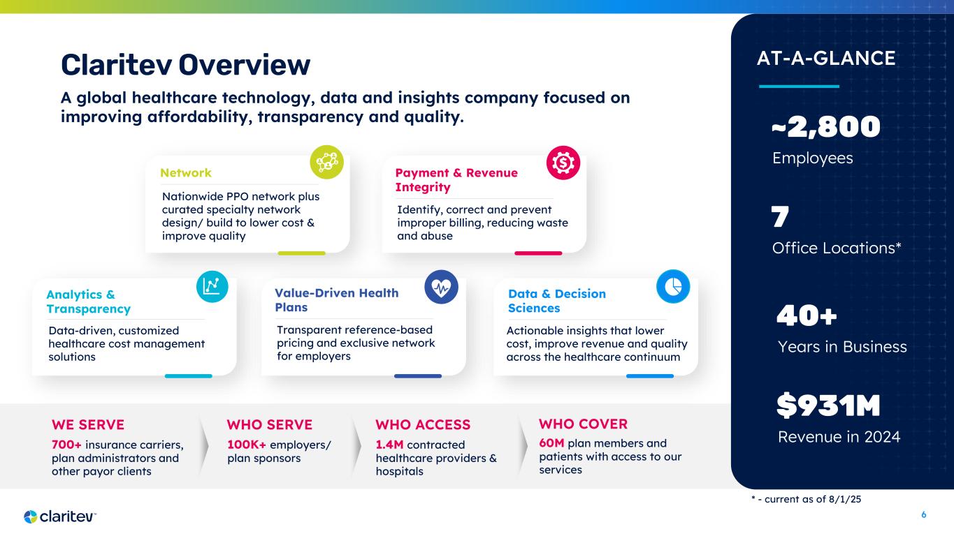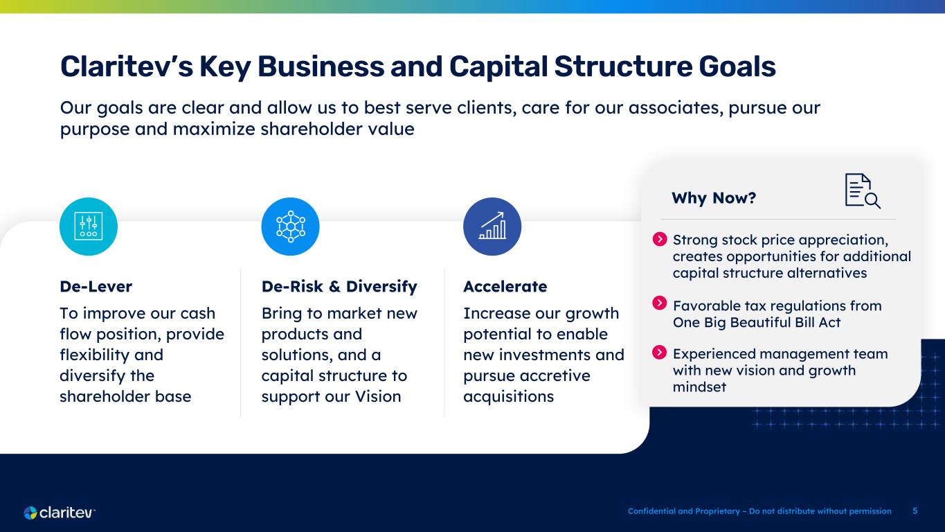 5 Claritev’s Key Business and Capital Structure Goals Our goals are clear and allow us to best serve clients, care for our associates, pursue our purpose and maximize shareholder value De-Lever To improve our cash flow position, provide flexibility and diversify the shareholder base De-Risk & Diversify Bring to market new products and solutions, and a capital structure to support our Vision Accelerate Increase our growth potential to enable new investments and pursue accretive acquisitions Confidential and Proprietary – Do not distribute without permission Why Now? Strong stock price appreciation, creates opportunities for additional capital structure alternatives Favorable tax regulations from One Big Beautiful Bill Act Experienced management team with new vision and growth mindset