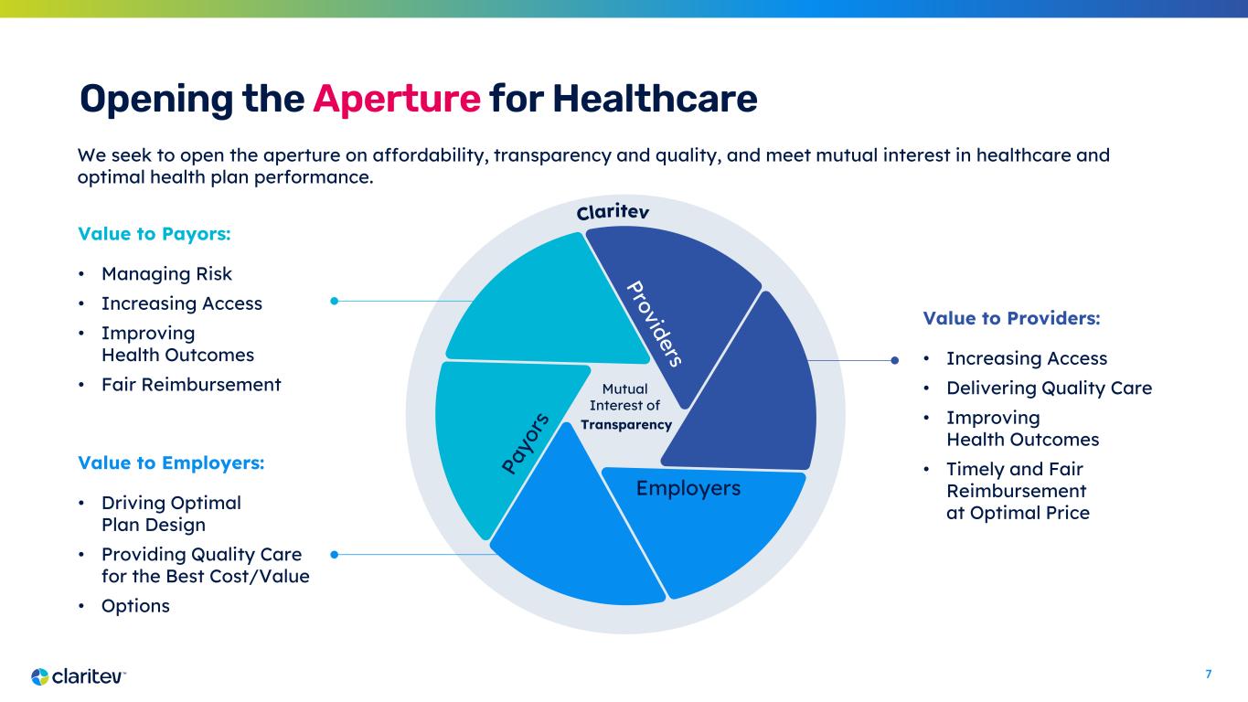 6 Claritev Overview 700+ insurance carriers, plan administrators and other payor clients 100K+ employers/ plan sponsors WHO SERVEWE SERVE A global healthcare technology, data and insights company focused on improving affordability, transparency and quality. 60M plan members and patients with access to our services WHO COVER 1.4M contracted healthcare providers & hospitals WHO ACCESS 40+ Years in Business $931M Revenue in 2024 ~2,800 Employees 7 Office Locations* AT-A-GLANCE Nationwide PPO network plus curated specialty network design/ build to lower cost & improve quality Network Identify, correct and prevent improper billing, reducing waste and abuse Payment & Revenue Integrity Data-driven, customized healthcare cost management solutions Analytics & Transparency Transparent reference-based pricing and exclusive network for employers Value-Driven Health Plans Actionable insights that lower cost, improve revenue and quality across the healthcare continuum Data & Decision Sciences * - current as of 8/1/25