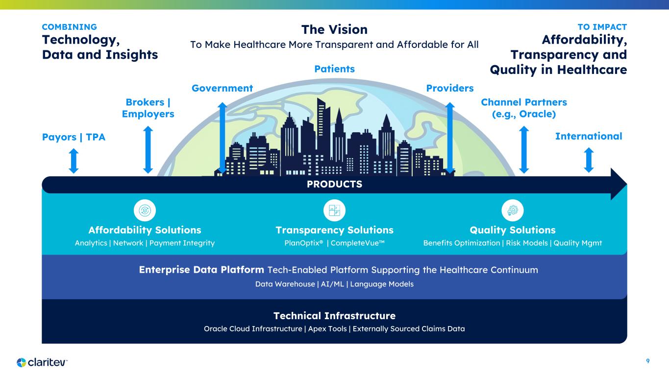 8 Global healthcare is at an inflection point, and we are uniquely positioned to transform it with technology and data Harness the Power of Transparency to Enable Greater Insights Utilize publicly available data to provide actionable population health and financial insights that lower cost, improve quality and increase revenue Empower Healthcare Leaders with Advanced Analytics to Drive Better Outcomes Use AI-driven data models and platforms to transform complex data into clear intelligence that help optimize health plans, enhance health outcomes and control costs Optimize Healthcare Economics to Reduce Friction and Operational Efficiencies Apply cost containment data services and solutions to deliver value across all healthcare stakeholders Improve Claims Processing to Enhance Revenue Performance Deliver innovative technology using customized rules engines that automate processes and reduce waste and abuse across the healthcare continuum M A R K E T P R E S S U R E S COST PRESSURES Inflation & Labor WORKFORCE Skills & Shortages COVERAGE & ACCESS Telehealth & Utilization MANDATED INSURANCE Increasing Complexity of Payor Market REGULATORY Evolving Regulations M A R K E T D E M A N D S PATIENT- CENTRIC Convenience & Accessibility LOWER COSTS Opaque/Expensive DATA CONTROL Privacy and Interoperability CARE QUALITY Better Outcomes INNOVATION AI & Prediction
