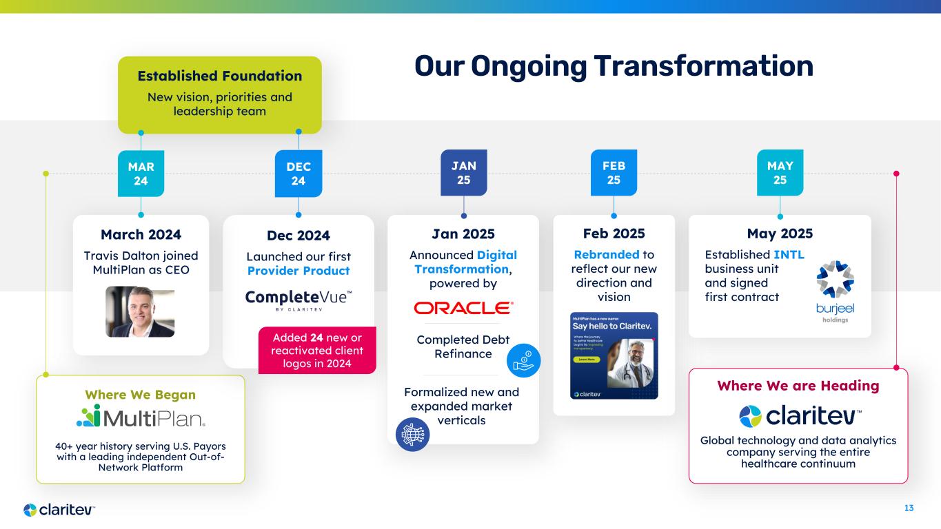 12 Claritev Offering Value-Driven Health Plan Services Our Expansion Initiatives Will Double the Addressable Market $14-18B Claritev Offerings CORE VERTICALS Mid-single-digit long term growth EXPANSION AREAS High single/low double-digits long term growth • OON Analytics $3- 4B • Provider Networks $5-6B • Payment & Revenue Integrity $6-8B Alternative Employer Networks Payor & Provider Analytics Claritev Offering Data & Decision Science Solutions Network-Based Solutions Analytics-Based Solutions Payment & Revenue Integrity Solutions Sources: Company management, Wall Street research $1-2B $12-14B Long-Term International Opportunity >$1B